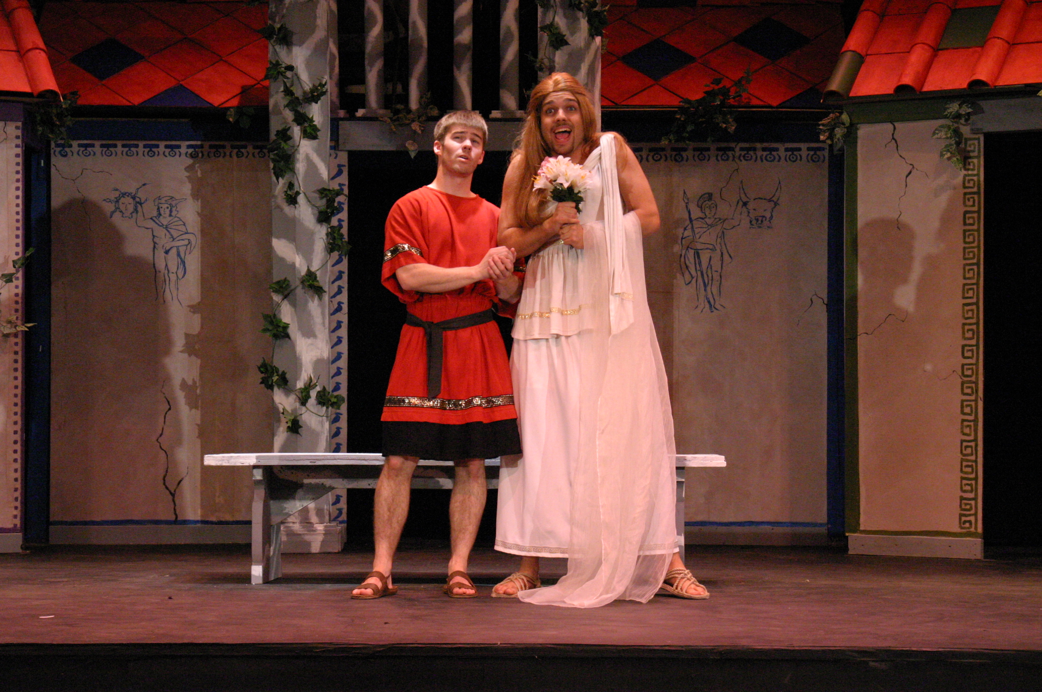 Pseudolus (Tim Abrahamsen '06) get Hysterium (Daniel Perez '10) all dolled up for the captain. (credit: Jax Kirtley)