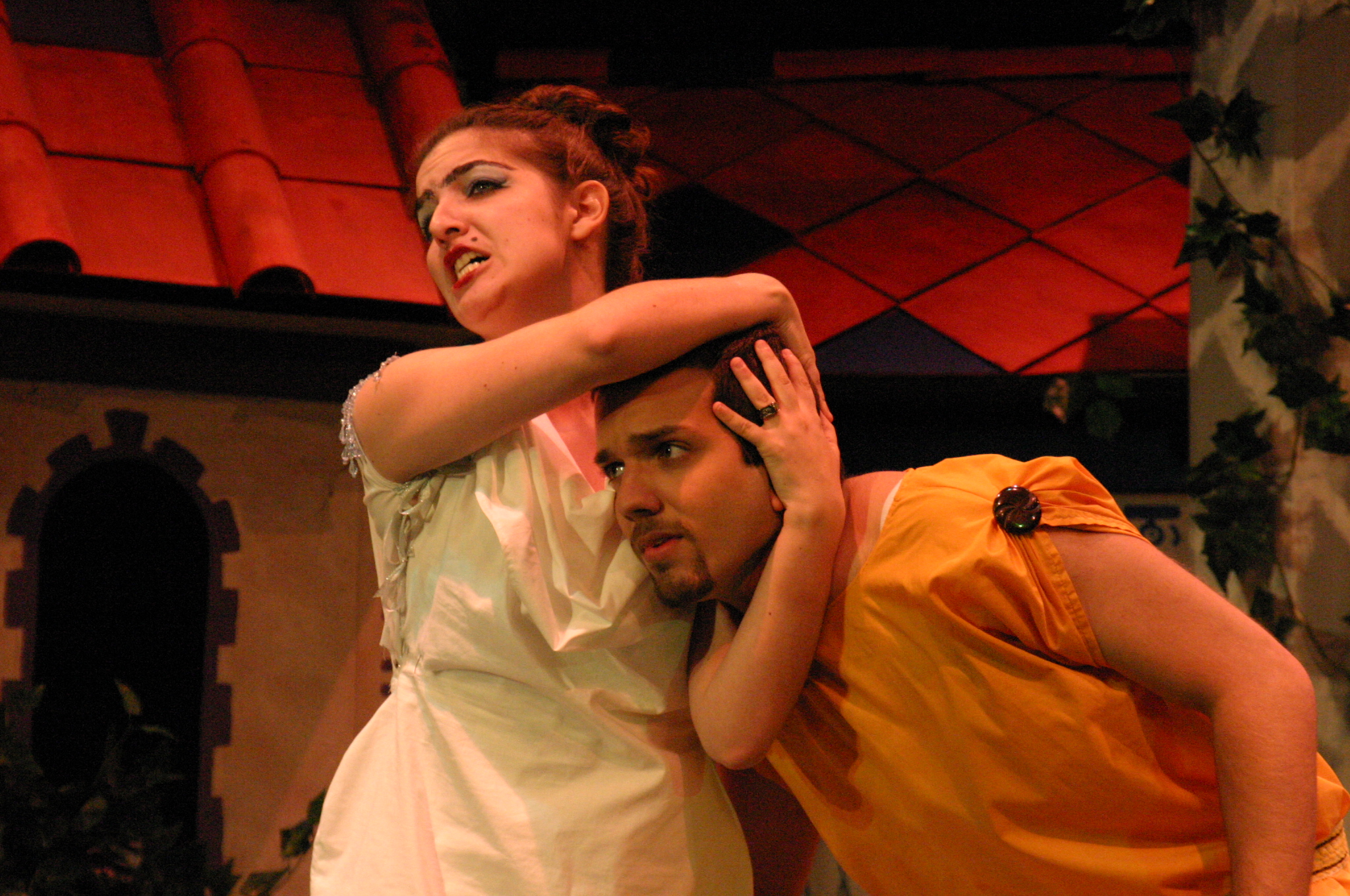Philia (Kathleen McEnnis '07) shows Hero (Yonatan Arie Gray '10) how she will get back at her captain in 'That'll Show Him'. (credit: Jax Kirtley)