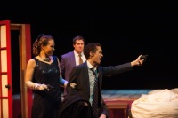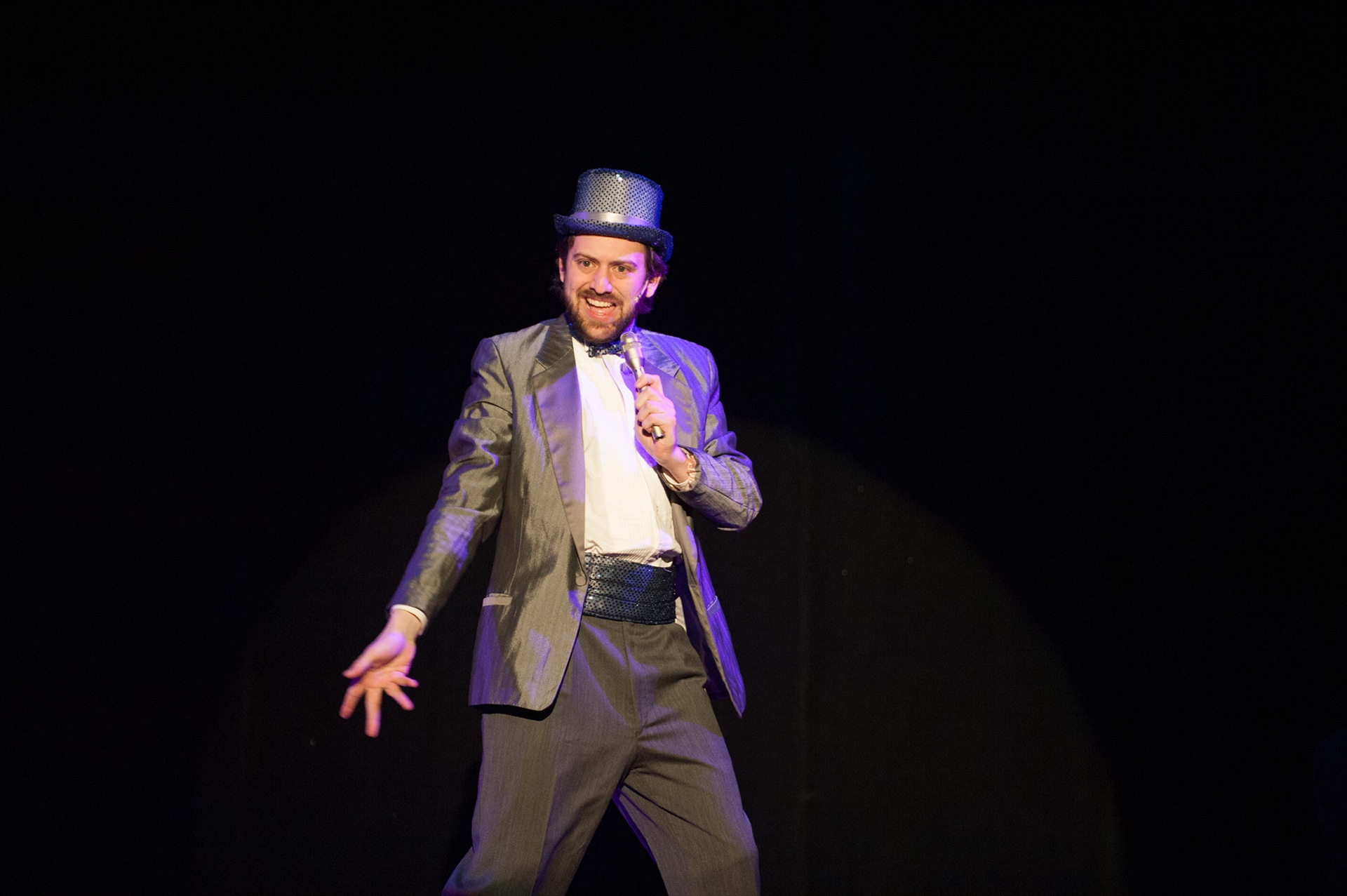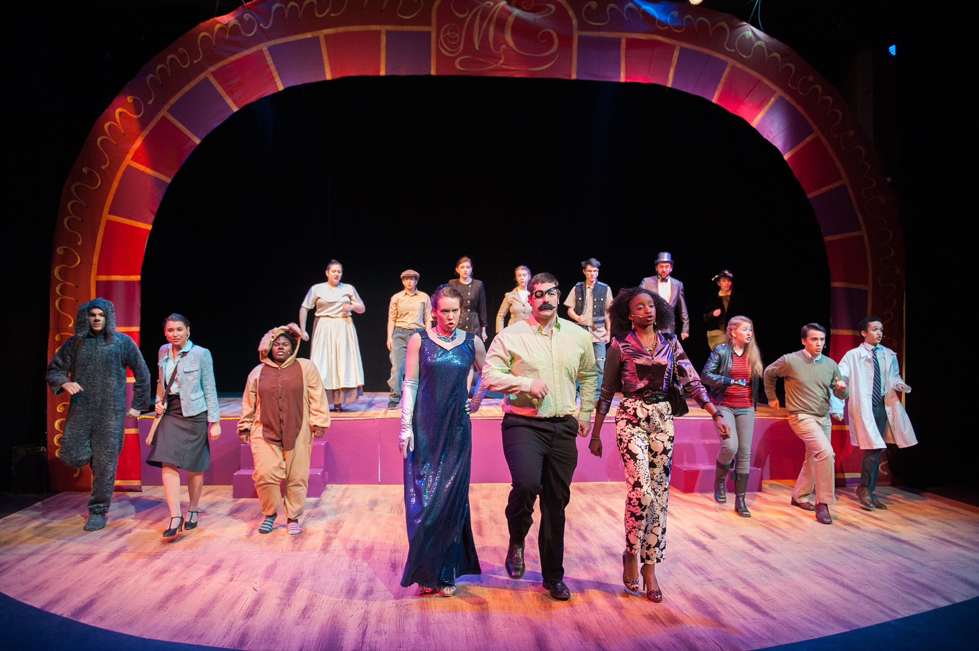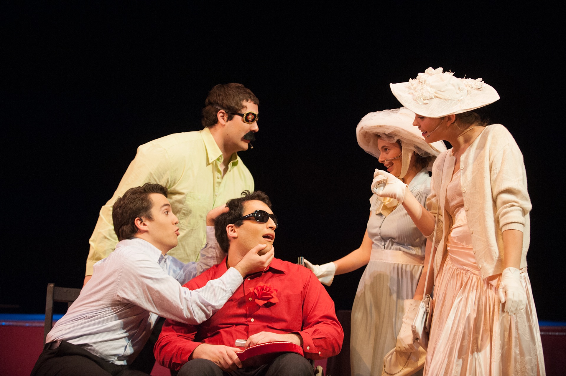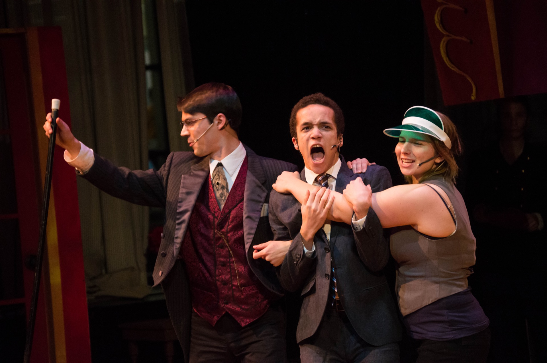 The cast admonishes the audience that "Something Funny's Going On". (credit: Alexander C. Bost) The boarders (Cole Houston '15, Brett Jordan, Michael Greshko G, Melanie Abrams '17, and Christina Wettersten '15) examine Harry's Telegram. (credit: Staly Chin '15) Harry and uncle ensure their fellow train passengers that it's "Good to be Alive". (credit: Alexander C. Bost) Harry and Annabel confront each other in "Dogs vs. You". (credit: Staly Chin '15) Dominique Du Monaco (Allison Hamilos G) and her backup dancers. (credit: Alexander C. Bost) Rita thinks of her potential future life with Tony. (credit: Alexander C. Bost) Harry and Annabel share a toast before parting ways. (credit: Alexander C. Bost) Tony Hendon (Geoff Hegg '16) recounts his the death of his best friend Luigi. (credit: Alexander C. Bost) Rita and Tony during the "Bows". (credit: Alexander C. Bost) |