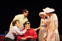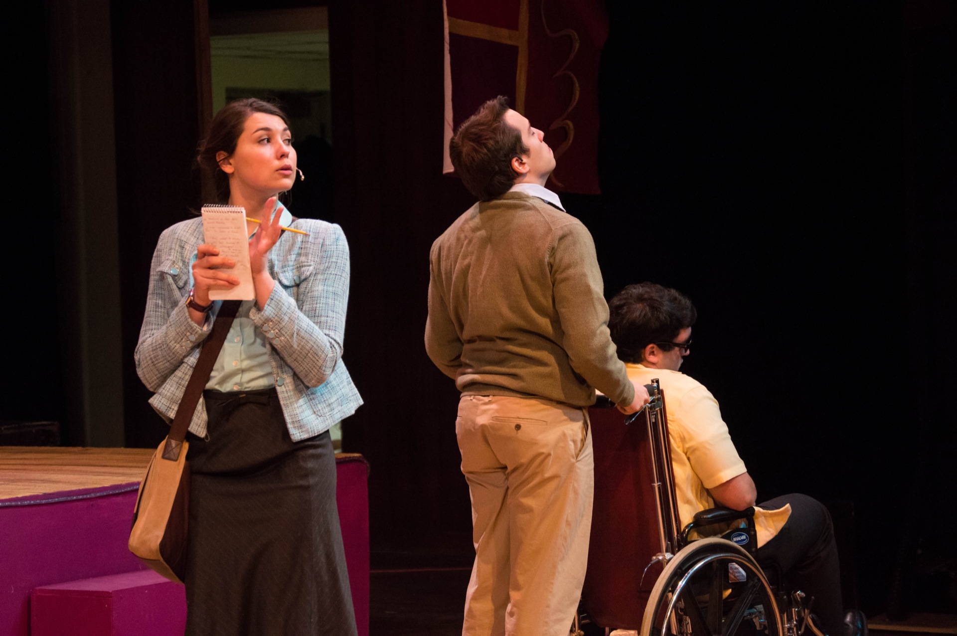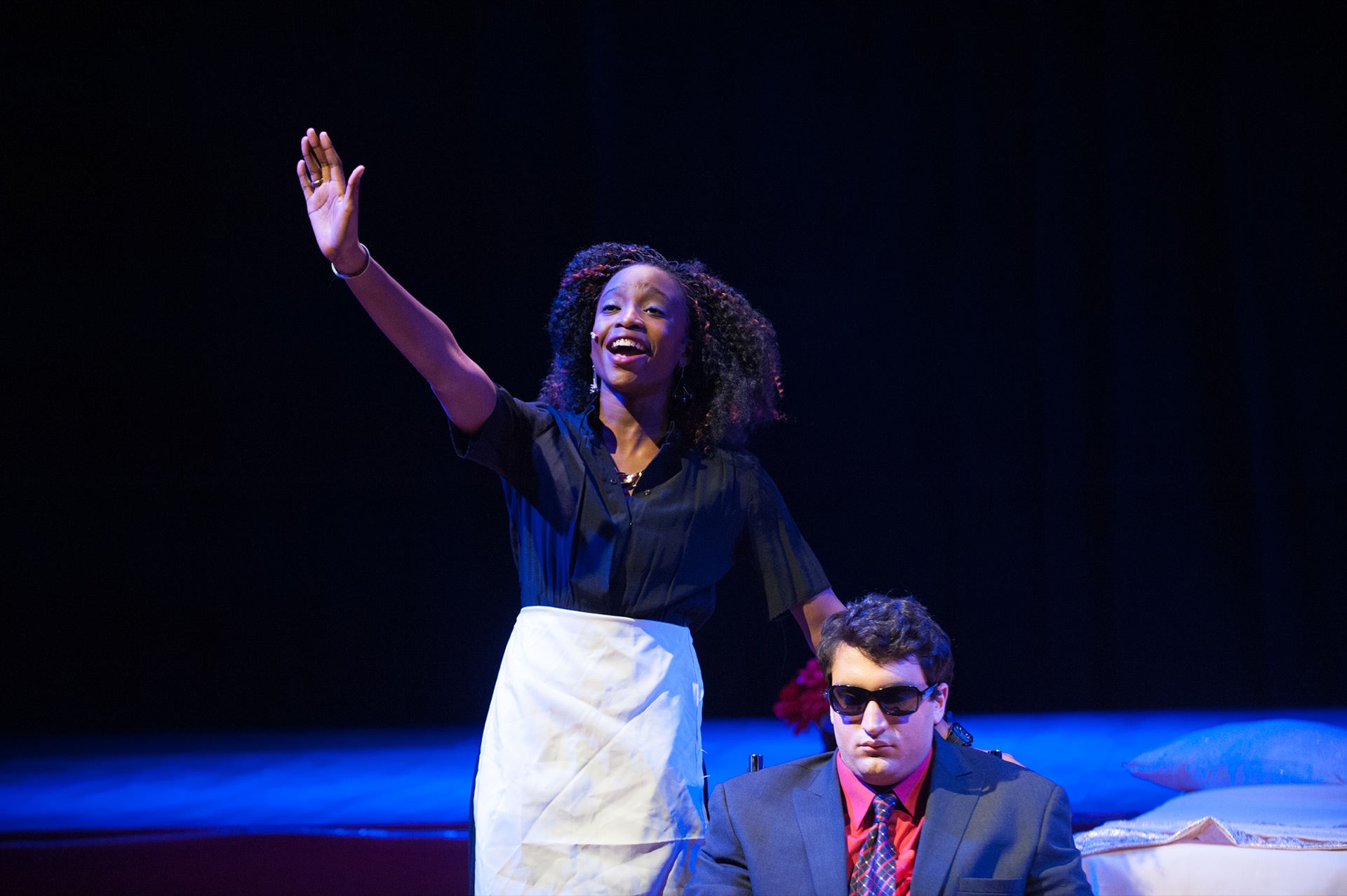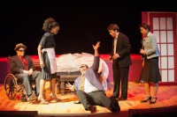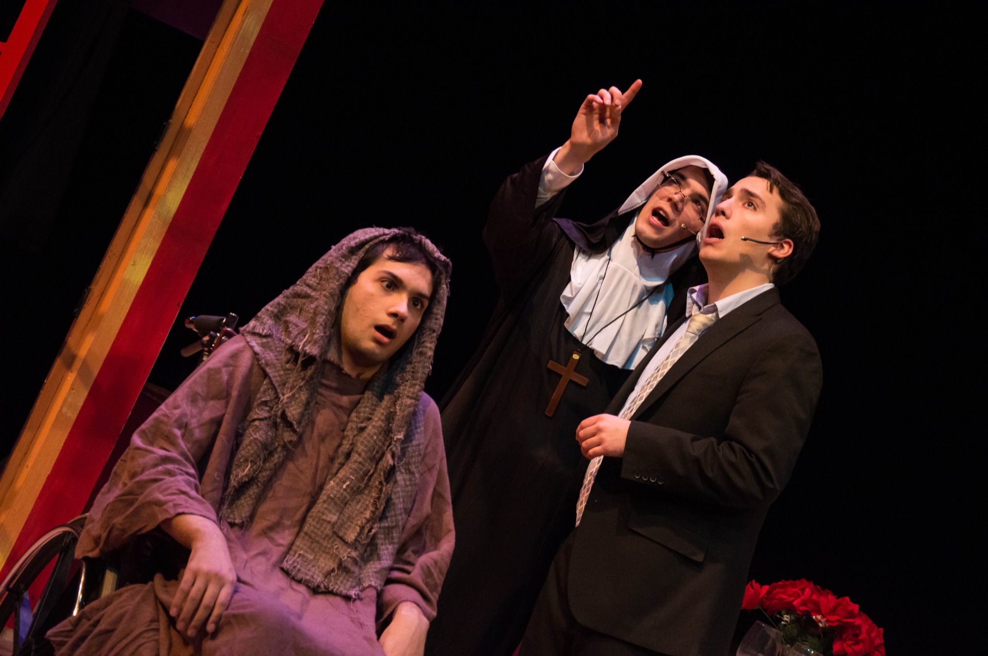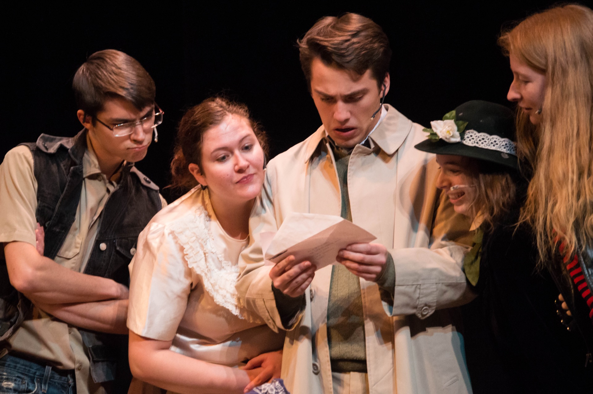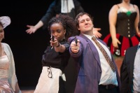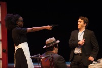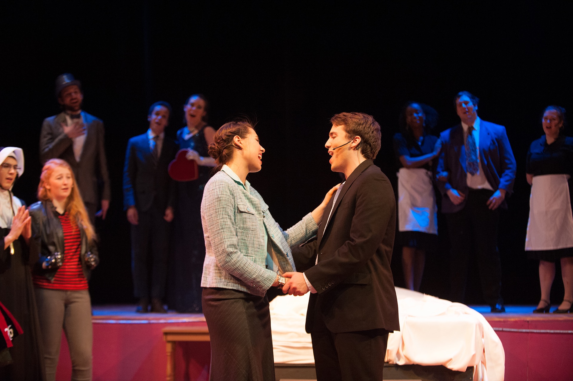 The Landlady (Brett Jordan) and Spinster (Melanie Abrams '17) examine a telegram meant for Mr. Witherspoon. (credit: Staly Chin '15) Rita LaPorta (Tobi Amos '15) explains the circumstances of her lover Tony's death to her cousin, Vinnie DiRuzzio (Josh Scherrer '18), in "Rita's Confession". (credit: Staly Chin '15) Annabel Glick (Carrie Fowle '18) takes detailed notes on Harry's activities with his uncle. (credit: Staly Chin '15) The Emcee (Matt Peairs G) extols the wonders of "Monte Carlo". (credit: Alexander C. Bost) Annabel, in a moment of quiet reflection. (credit: Staly Chin '15) The Nun (Cole Houston '15) mistakes a Leper (David Favela '18) for Harry's uncle. (credit: Staly Chin '15) Rita holds Harry at gunpoint as she takes the body. (credit: Alexander C. Bost) Annabel, Harry, and the cast assure that, after all, it's still "Good to be Alive". (credit: Alexander C. Bost) |