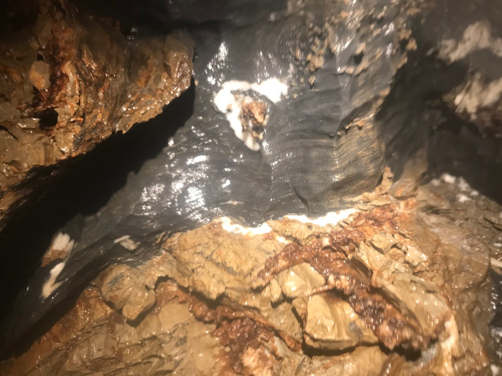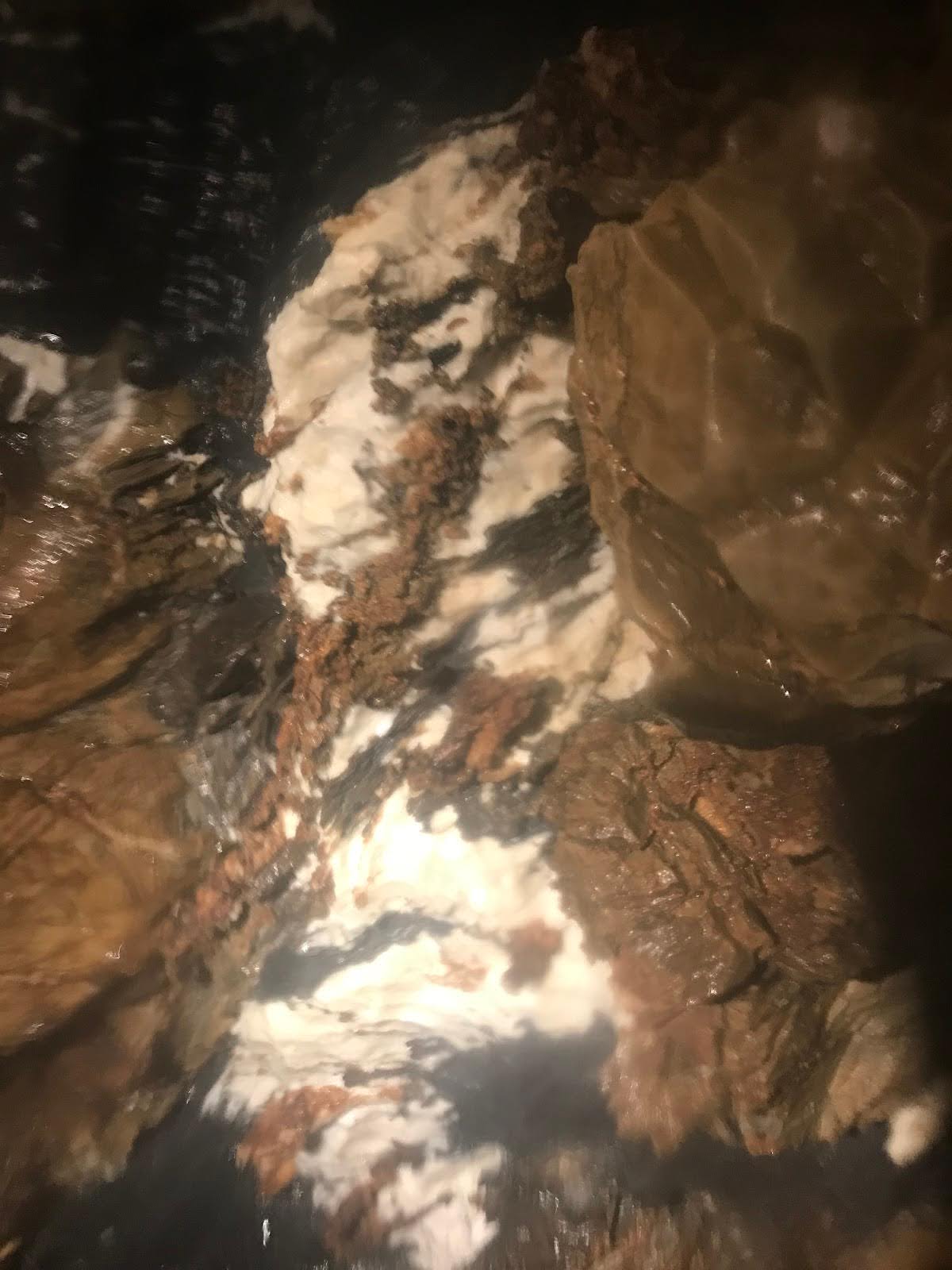 The cave became wet with a river running through it. We then had some downclimbs through falling water. While they were sometimes not all that straightforward, and the water was rather cold, it was very fun to climb through the falling water, and navigate the downclimb while also trying to maximally avoid the centre of the climb where there was actively water falling. During these downclimbs, we also passed packs, and the tripleader talked to us about what one should pack with them and made comments about the weight of our packs. After a bit more navigating of the climb (including another waterfall downclimb and a traverse that involved rope), we got the the “big room” where Josh revealed one of the things that made his pack heavy – a light up orb that Rihn and he had made as part of pyrofox. We got to sit around and eat lunch in this very large open space, with ceiling heights as large as 38 feet, using this rainbow orb as illumination. After this we broke into smaller groups and explored the big room. It had lots of pretty flowstone and other formations, some of which were caution taped off to make sure that they would not be disturbed. After this, it was time to head back. We backtracked, doing the traverse and crawling and climbing across a large drop while attached to rope and climbing back up the downclimbs.
