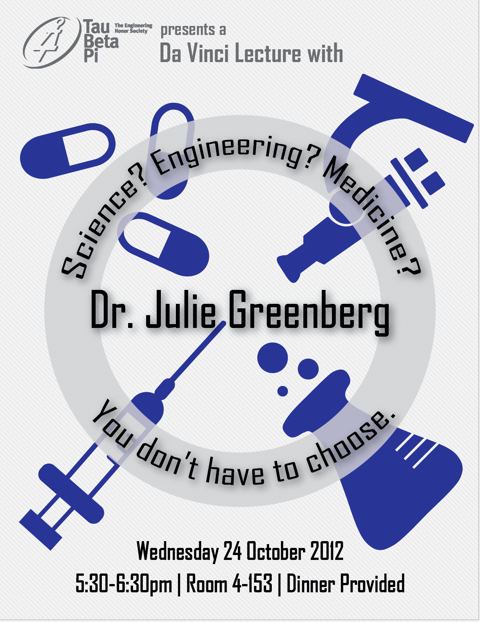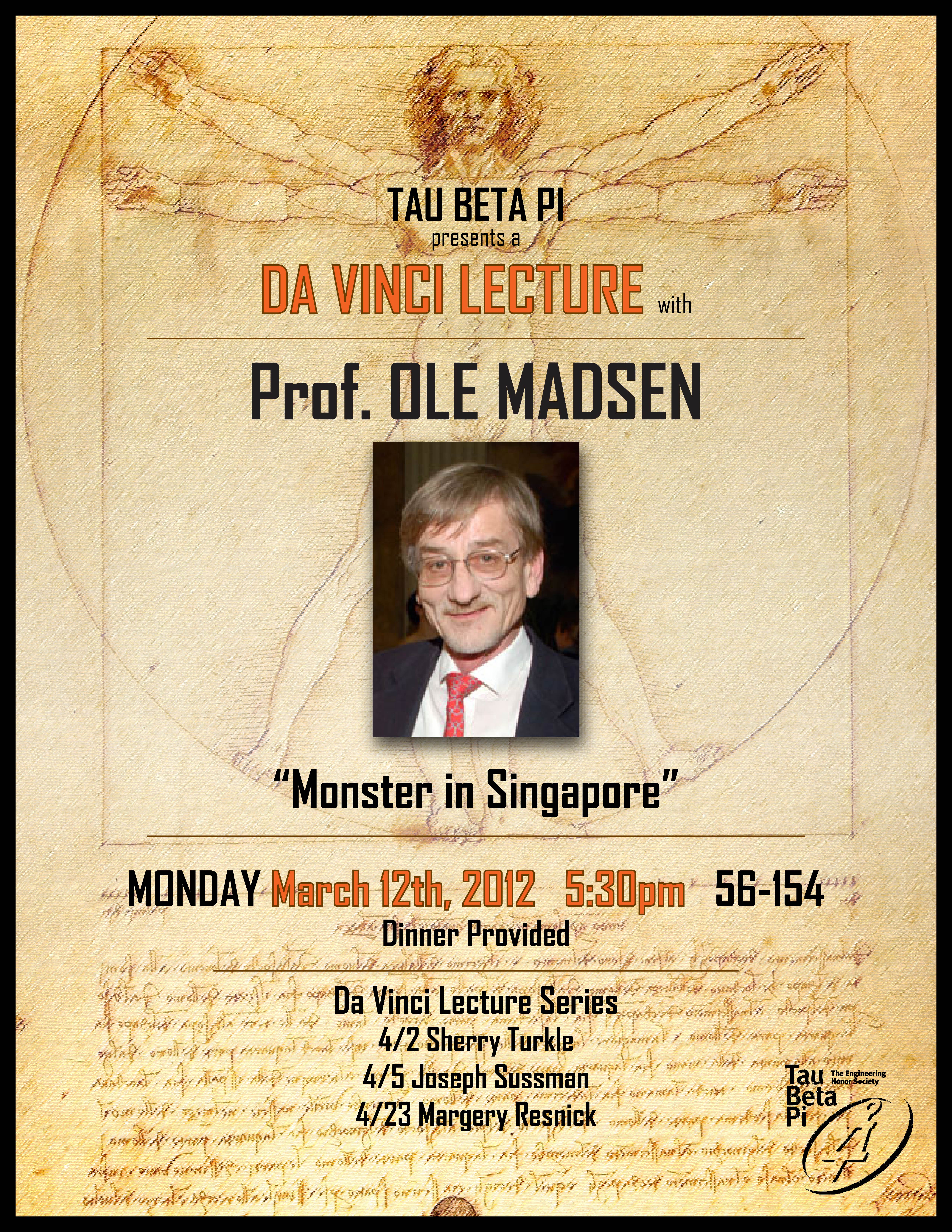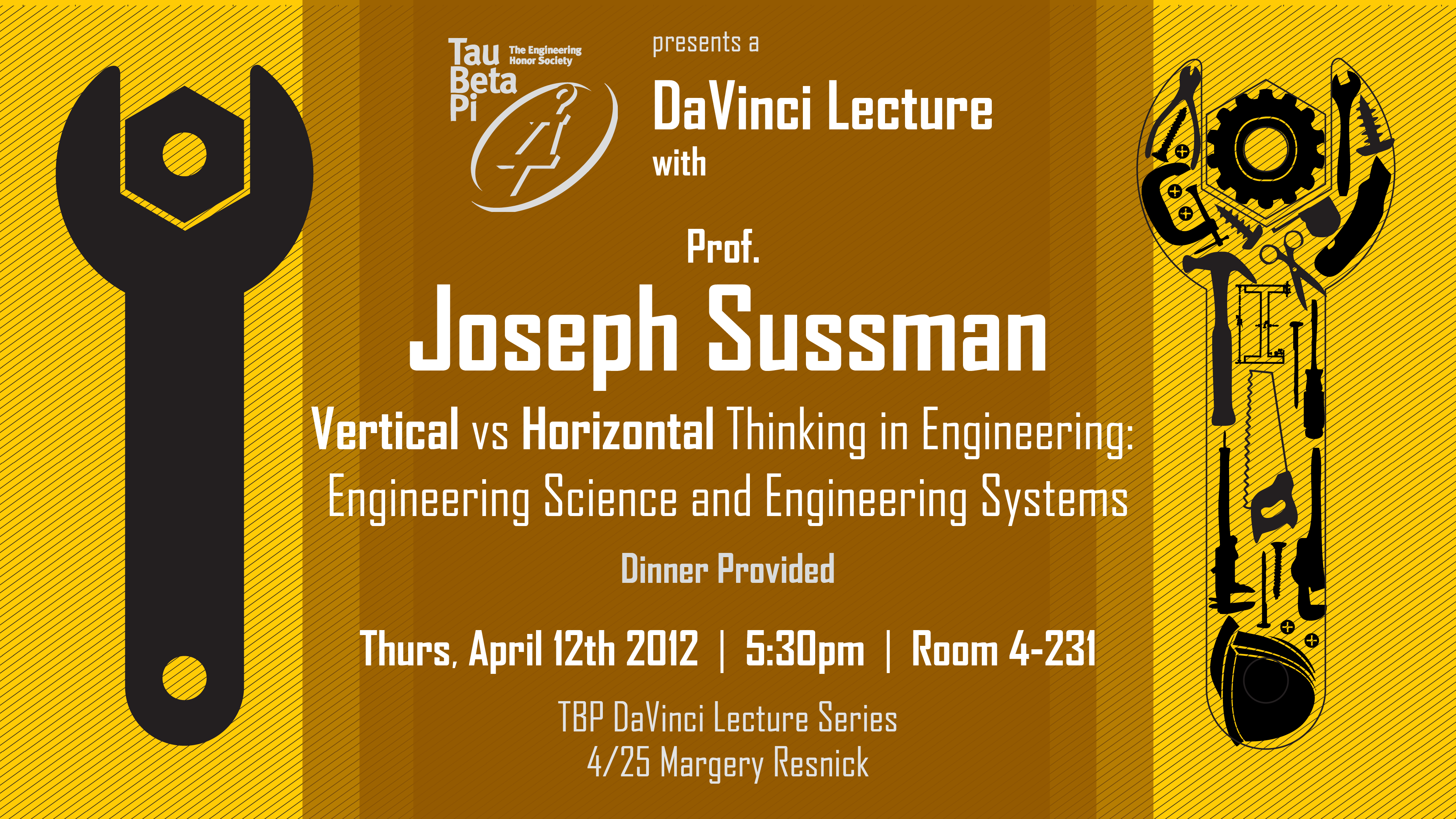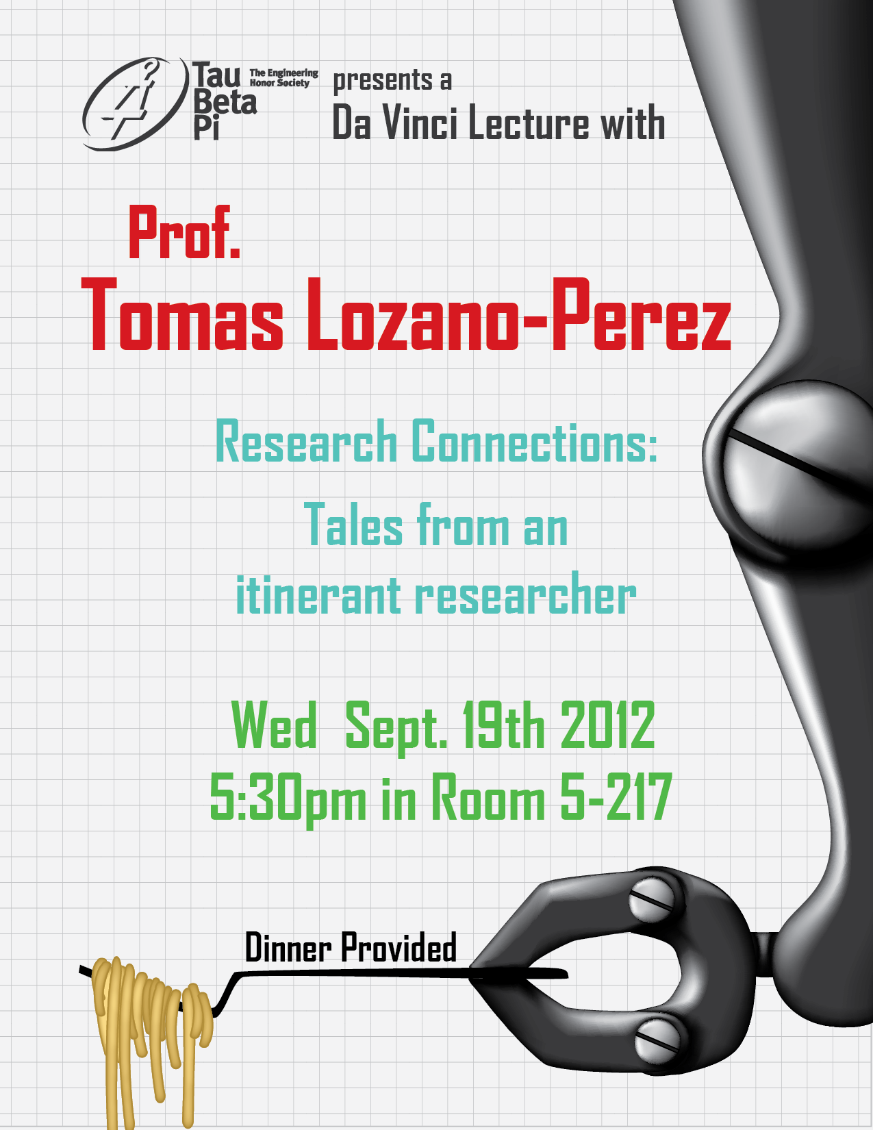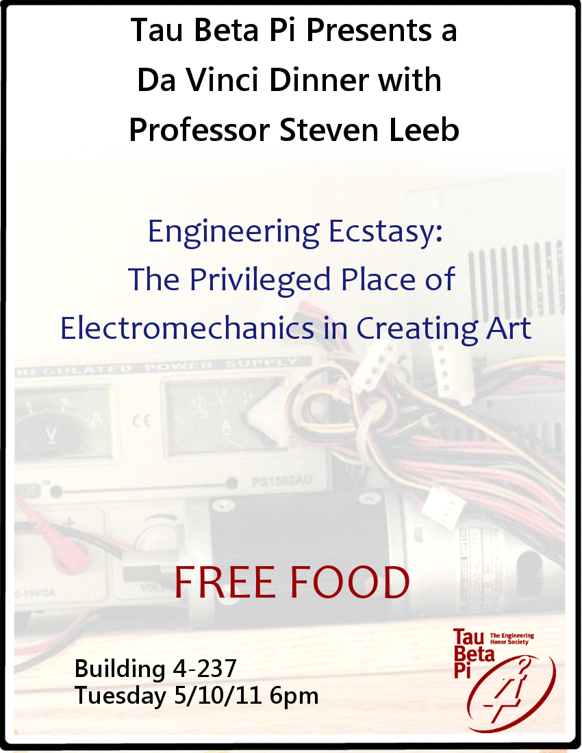 As stated in the preamble to our constitution, one of the major goals of Tau Beta Pi, the National Engineering Honor Society, is "to foster a spirit of liberal culture at engineering colleges." Towards this end, the MIT chapter of Tau Beta Pi is pleased to host a series of dinner lectures, the TBP Leonardo da Vinci Dinners. MIT faculty members and TBP students from a wide variety of departments are invited to each dinner to enjoy good food, listen to an interesting presentation on a variety of topics, and engage in hearty conversation in the spirit of Leonardo da Vinci: artist, architect, engineer, scientist, and philosopher. It is our hope that by bringing together people from many different fields we can foster the kind of intellectual diversity and love of knowledge exemplified by Leonardo and representative of Tau Beta Pi. These elegant dinners bring together about twenty TBP members and several faculty members. Each lecture begins at 6:00 PM and lasts approximately two hours. One of the faculty members gives a short presentation which acts as a catalyst for conversation during dinner. The presentations are meant to confront us with relevant issues of science, society, and culture: in short, to foster a spirit of liberal culture here at MIT. Dinner is provided free of charge to all guests.