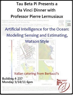 Title Professor Date Aircraft Recovery Raymond McCord 2/22/2011 Artificial Intelligence for the Ocean: Modelling Sensing, and Estimating, Watson Style Prof. Pierre Lermusiaux 3/14/2011 Engineering Ecstasy: The Priviledged Place of Electromechanics in Creating Art Prof. Steven Leeb 5/10/2011