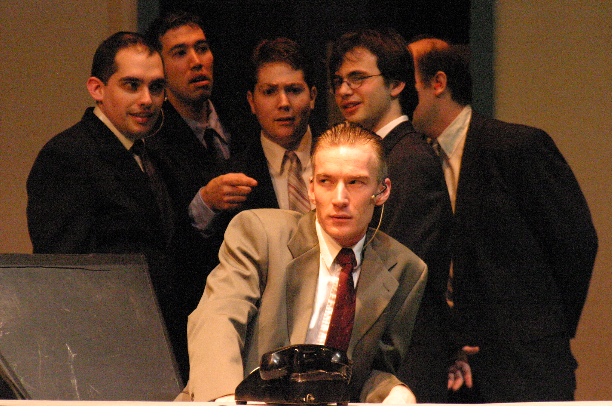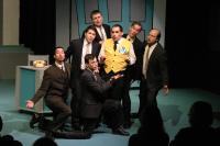 J. Pierrepont Finch (Matt Stern) reads from his book, "How To Succeed In Business Without Really Trying" (credit: Jax Kirtley) Finch (Matt Stern) consults the book for his next step (credit: Jax Kirtley) The firm's executives (Aaron Moronez, Jon Blum, David Glasser, Darrell Cain, Greg Lohman, Todd Radford, Dave Berger) (credit: Jax Kirtley) Holly Laird, Meghan Harris (credit: Jax Kirtley) Hedy (Zehra Fazal) shows off her "Paris original" (credit: Jax Kirtley) Hedy (Zehra Fazal) surprises Finch (Matt Stern) in the boss's office (credit: Jax Kirtley) "Cinderella Darling": Janet Lierberman, Kathleen McEnnis, Penny Cox, Michelle Fogerson, Nikki Akraboff, Holly Laird, Meagan Froemming, Meghan Harris (credit: Jax Kirtley) (credit: Jax Kirtley) "Brotherhood of Man": Matt Stern, Mike Rolish, David Glasser, Jon Blum, Todd Radford, Aaron Moronez, Dave Berger, Darrell Cain, Greg Lohman (credit: Jax Kirtley) |