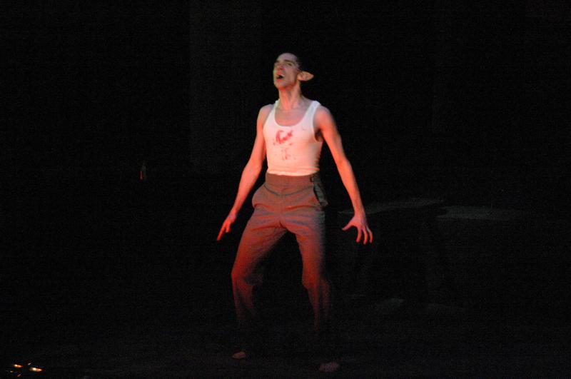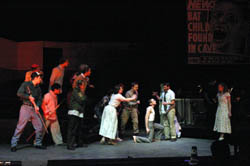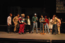 The Deputy (Joe Lowery, left) and Sheriff (Welkin Pope, green jacket) hand the Bat Boy (David Poland, in bag) to Shelley (Nori Pritchard) and Meredith (ML Peters, right). (credit: Jax Kirtley) Dr. Parker (Paul Giragos) reminisces with Meredith (ML Peters). (credit: Jax Kirtley) Meredith (ML Peters) teaches Edgar the Bat Boy (David Poland) to read. (credit: Jax Kirtley) The townspeople make "A Joyful Noise". (credit: Jax Kirtley) Dawn Erickson and Todd Radford take their vicious hunting dogs Muffin (as herself) and Mr. Princess Snugglebutt (Siris) on a hunt for the Bat Boy. (credit: Jax Kirtley) Edgar (David Poland) makes an "Apology to a Cow". (credit: Jax Kirtley) Shelley (Nori Pritchard, kneeling) comforts Edgar (David Poland) after the death of her parents. (credit: Jax Kirtley) DZ and the Joyful Noiz! (Jeremy Nimmer, Stephen Peters, Dennis Miaw, Sue Swalley, David Zych) (credit: Jax Kirtley) "Children, Children", with Pan (Joe Lowery, up center), Shelley and Edgar (Nori Pritchard and David Poland, center), surrounded by helpful forest creatures. And a lobster. (credit: Jax Kirtley) |
