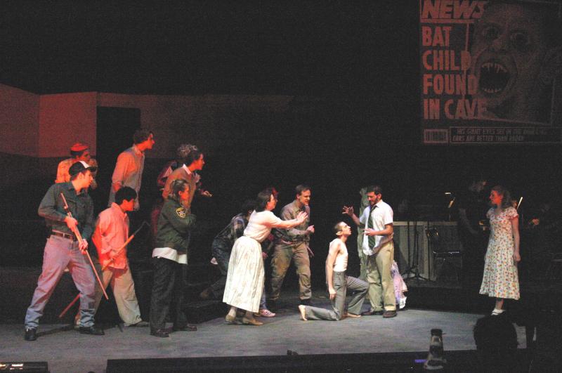 Meredith (ML Peters, left) and Shelley (Nori Pritchard) decide on a name for the Bat Boy (David Poland, center). (credit: Jax Kirtley) Bat Boy (David Poland) and Dr. Parker (Paul Giragos), surrounded by scary voices, reach a mutual detente. (credit: Jax Kirtley) Dr. Parker (Paul Giragos), Shelley (Nori Pritchard) and Meredith (ML Peters) test Edgar (David Poland) on his knowledge. (credit: Jax Kirtley) Rick (Pete Chambers, right) decides to take a vote about the fate of the Bat Boy. (credit: Jax Kirtley) Mrs. Taylor (TR Jordan, kneeling) grieves over the death of her son while townspeople (Edmund Golaski, Joe Lowery, Heather Doering, Welkin Pope) look on. (credit: Jax Kirtley) Meredith (ML Peters) and Dr. Parker (Paul Giragos) recall the origins of the Bat Boy. (credit: Jax Kirtley) "Hold Your Bat Boy" (credit: Jax Kirtley) Jamez Kirtley, Heather Brundage, and Erin McLaughlin in the "booth". (credit: Jax Kirtley) |