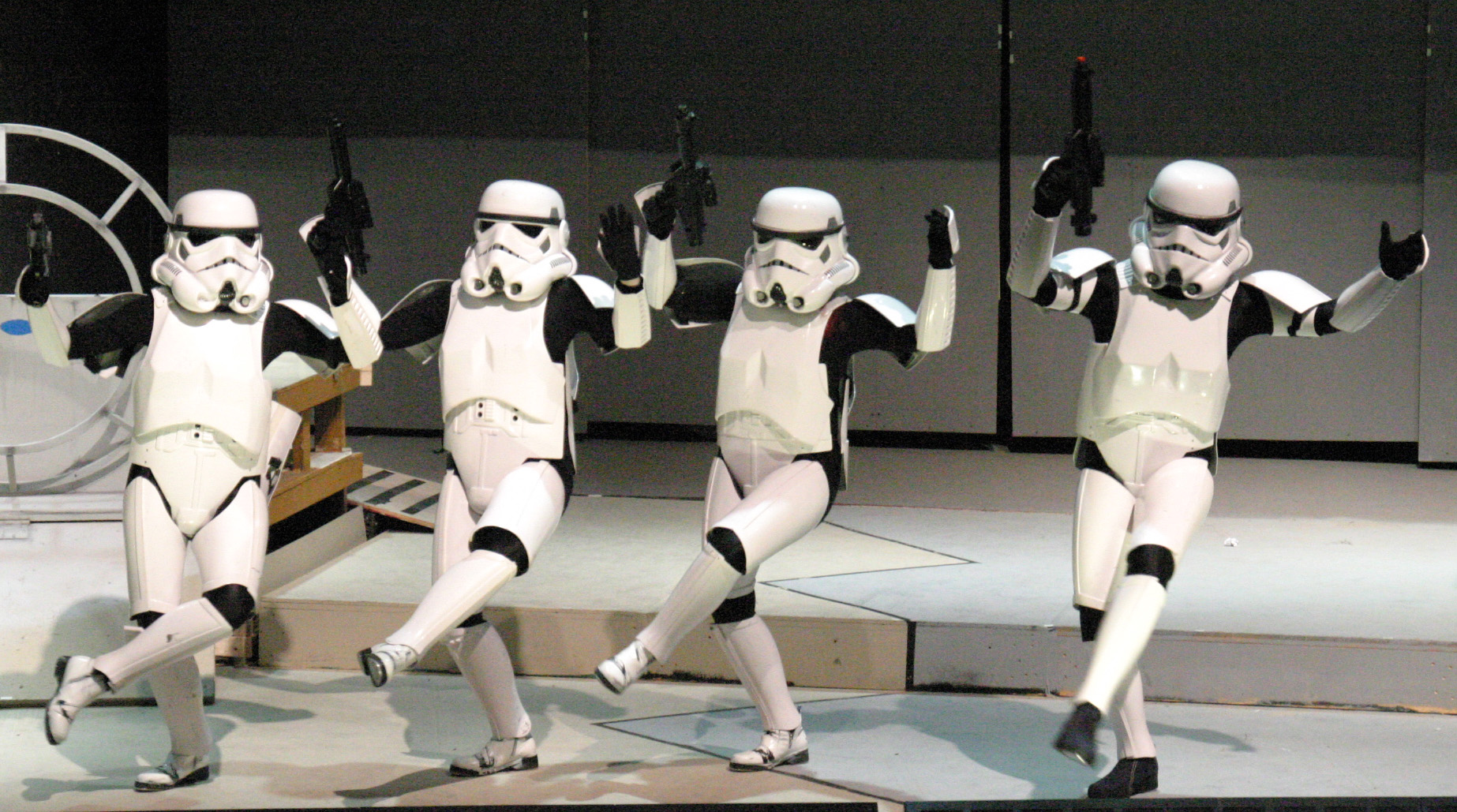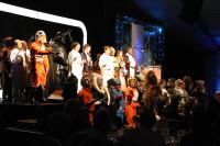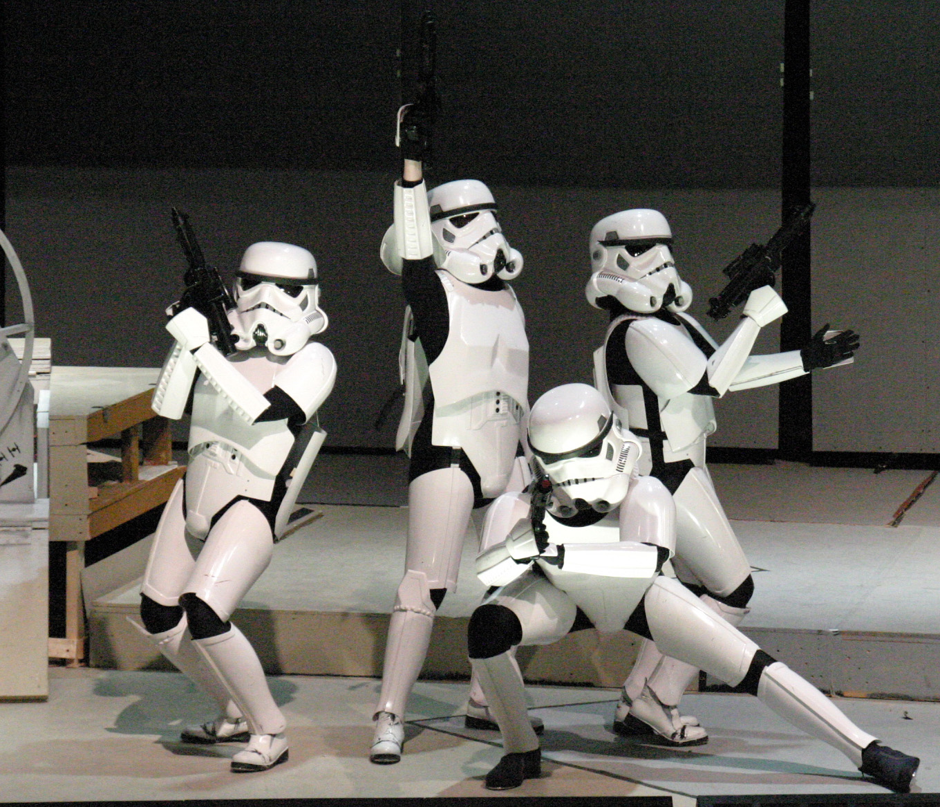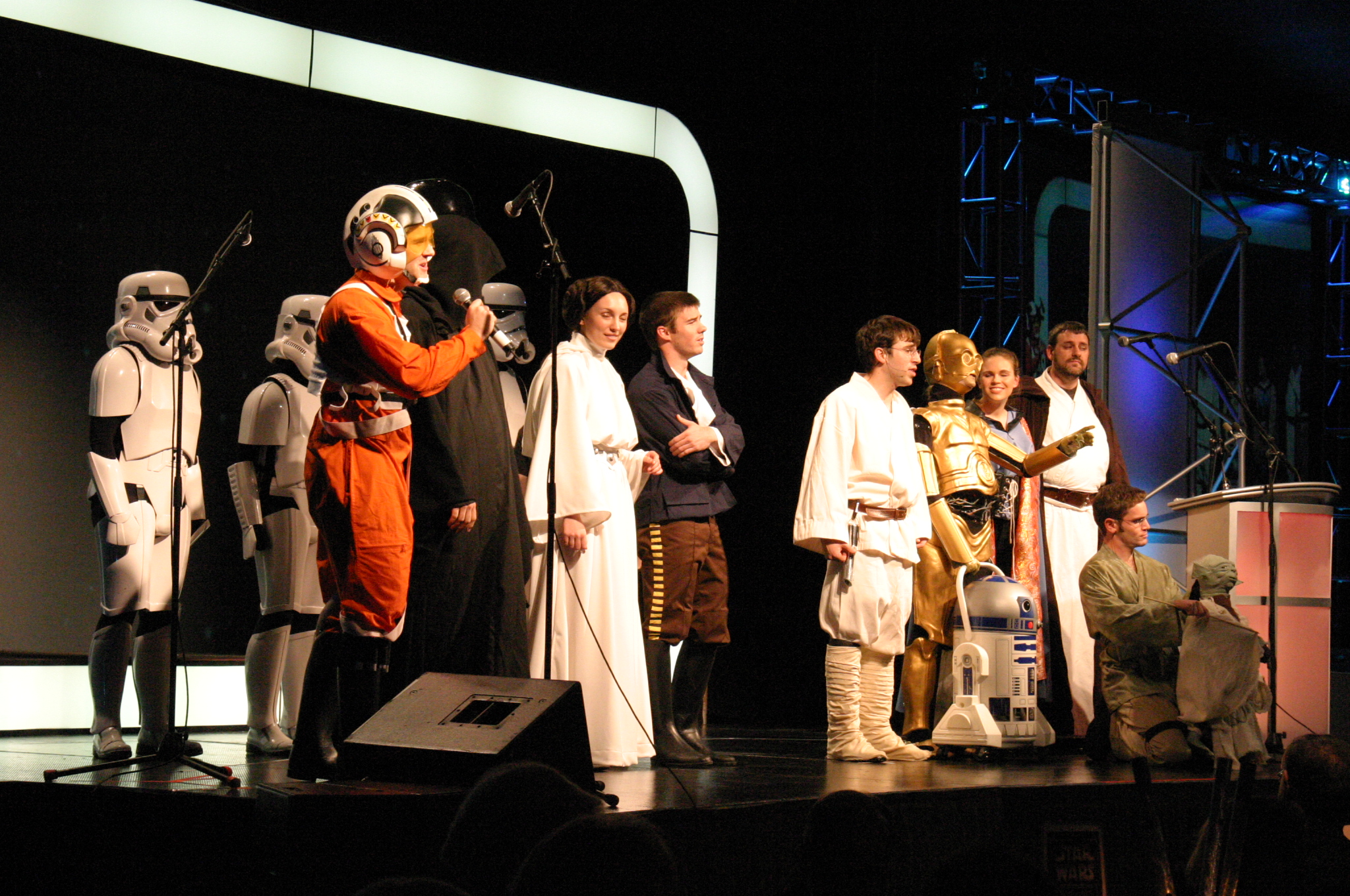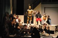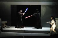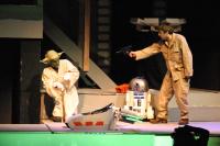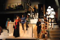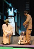 | The stormtroopers, Wedge, Vader, the Emperor, Leia, Han, Luke, Threepio, Lando, Obi-wan, and Yoda help the Boston Museum of Science kick off their gala opening of their Science of Star Wars exhibit by performing the opening number from the show, 'Trilogy Tonight.' (credit: Jax Kirtley) | The leads are joined by the entire company and crew for the finale of 'Trilogy Tonight' at the Museum gala performance. (credit: Jax Kirtley) |