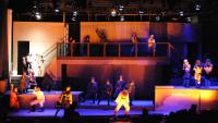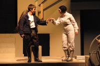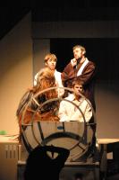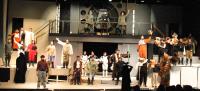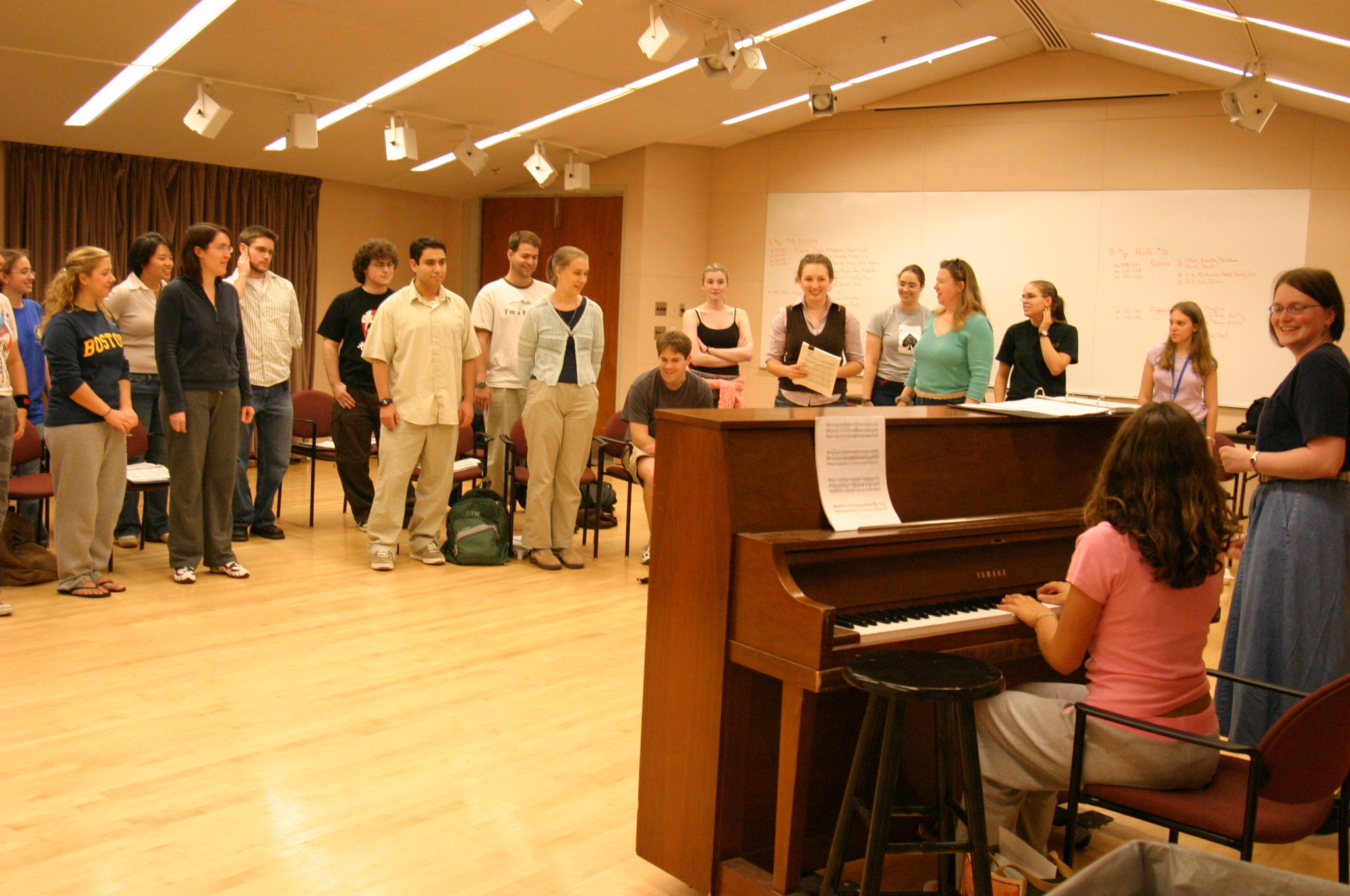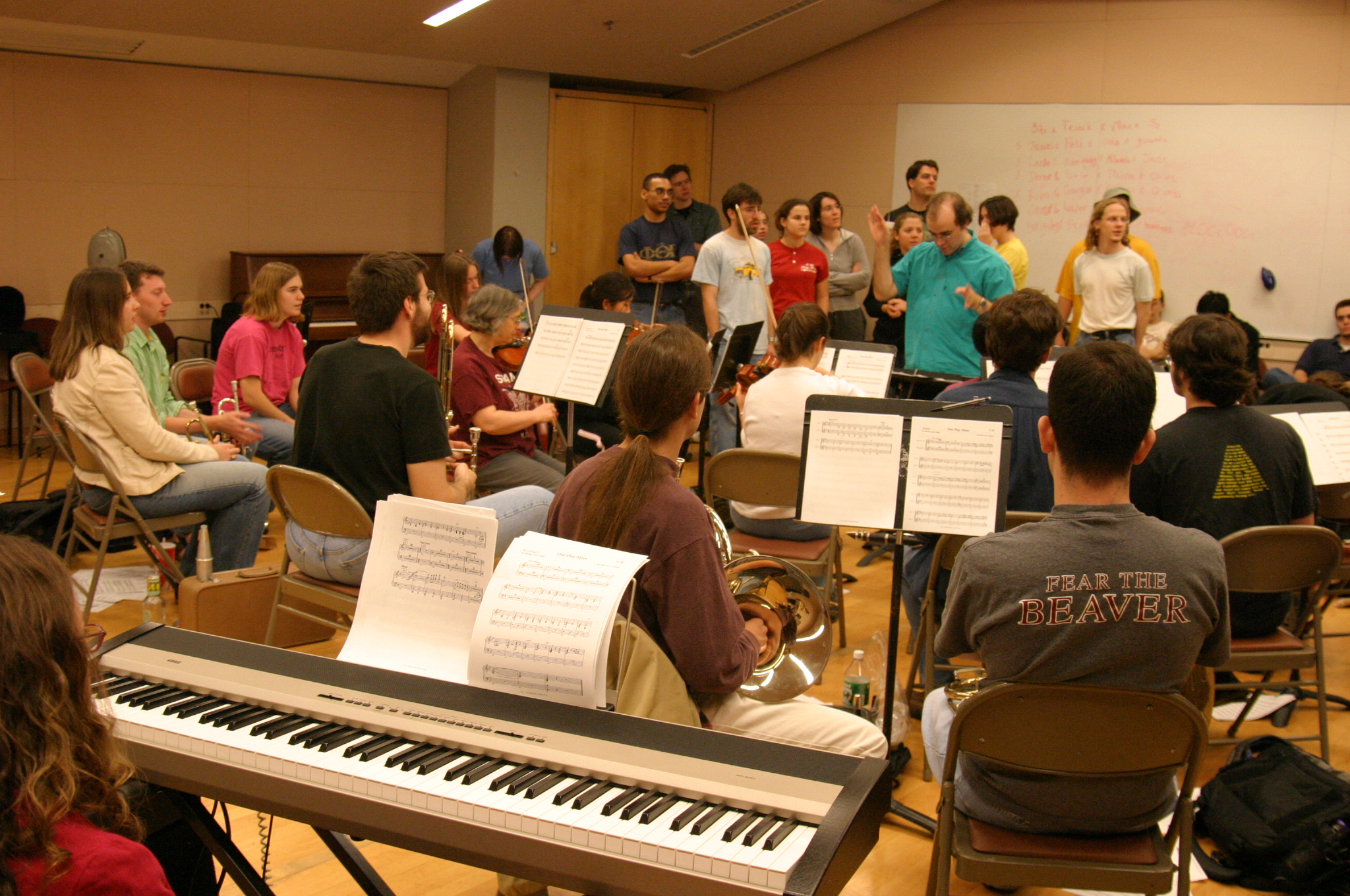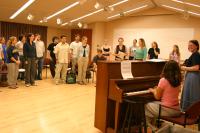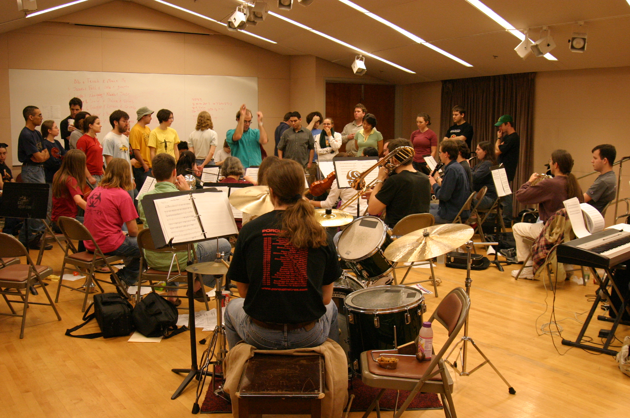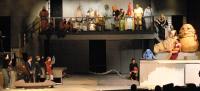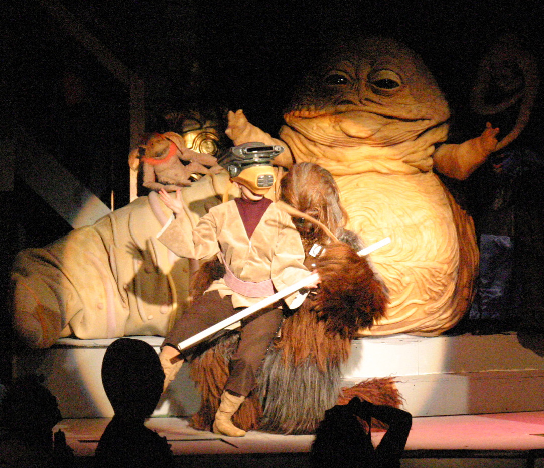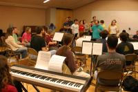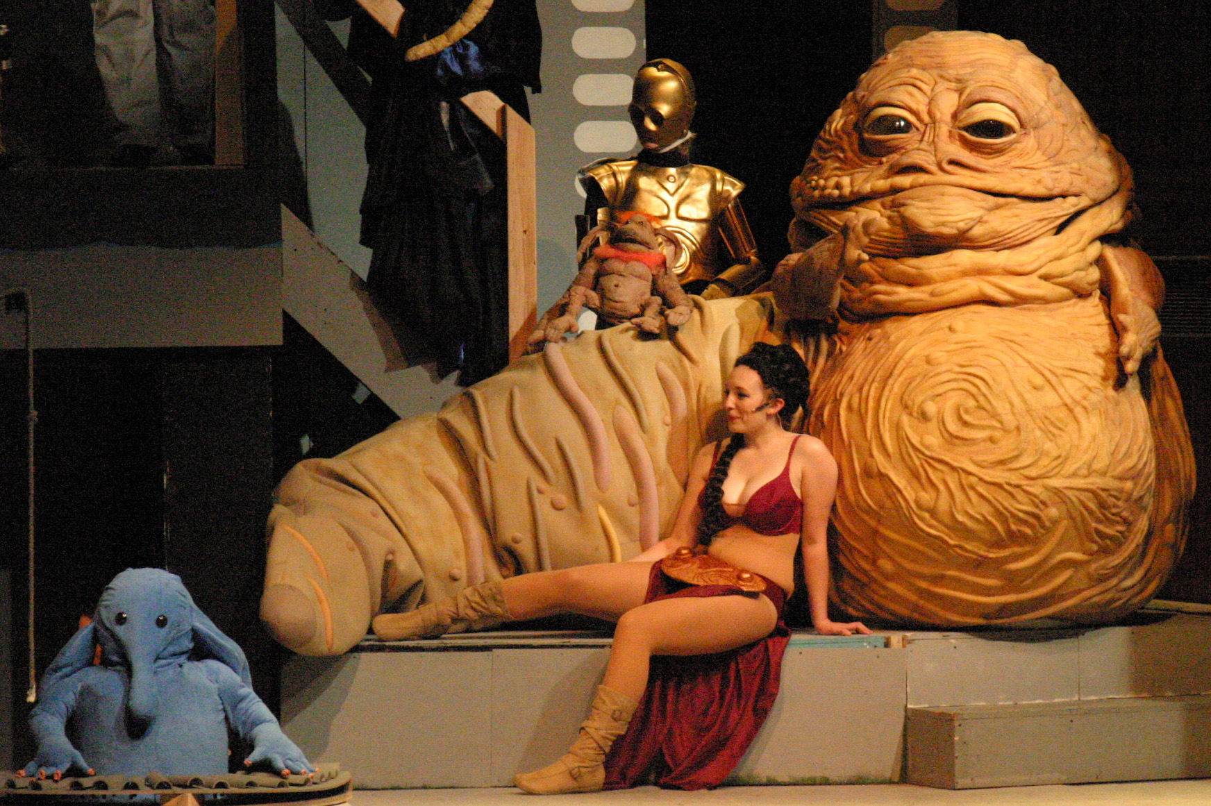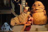 | Allison Volk W'09 (Leia in Boussh disguise) and Edmund Golaski '99 (Chewbacca) prepare to rehearse their song 'Mr. Chewbacca' for the first time with the Jabba puppet. (credit: Jax Kirtley) Assistant music director ML Peters (far right) leads the cast in learning harmony parts for some of the show's more difficult group numbers like 'Death Star Assault Medley,' 'The Battle of Hoth,' and 'Endorgame.' (credit: Jax Kirtley) | From behind, the Jabba's interior is exposed for puppeteer manipulation by Jamez Kirtley '94. (credit: Jax Kirtley) Orchestra and cast meet for the first time as music director and co-creator Stephen Peters leads them through singthrough to kick off prod week. (credit: Jax Kirtley) | Kenny Kamrin G rehearses with an early version of the Yoda puppet as Matt Ciborowski '08 (Luke) watches intently. (Yoda puppet by Kimmerie Jones) (credit: Jax Kirtley) (credit: Jax Kirtley) |