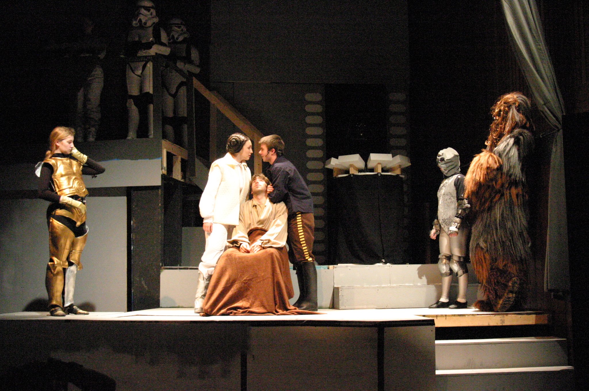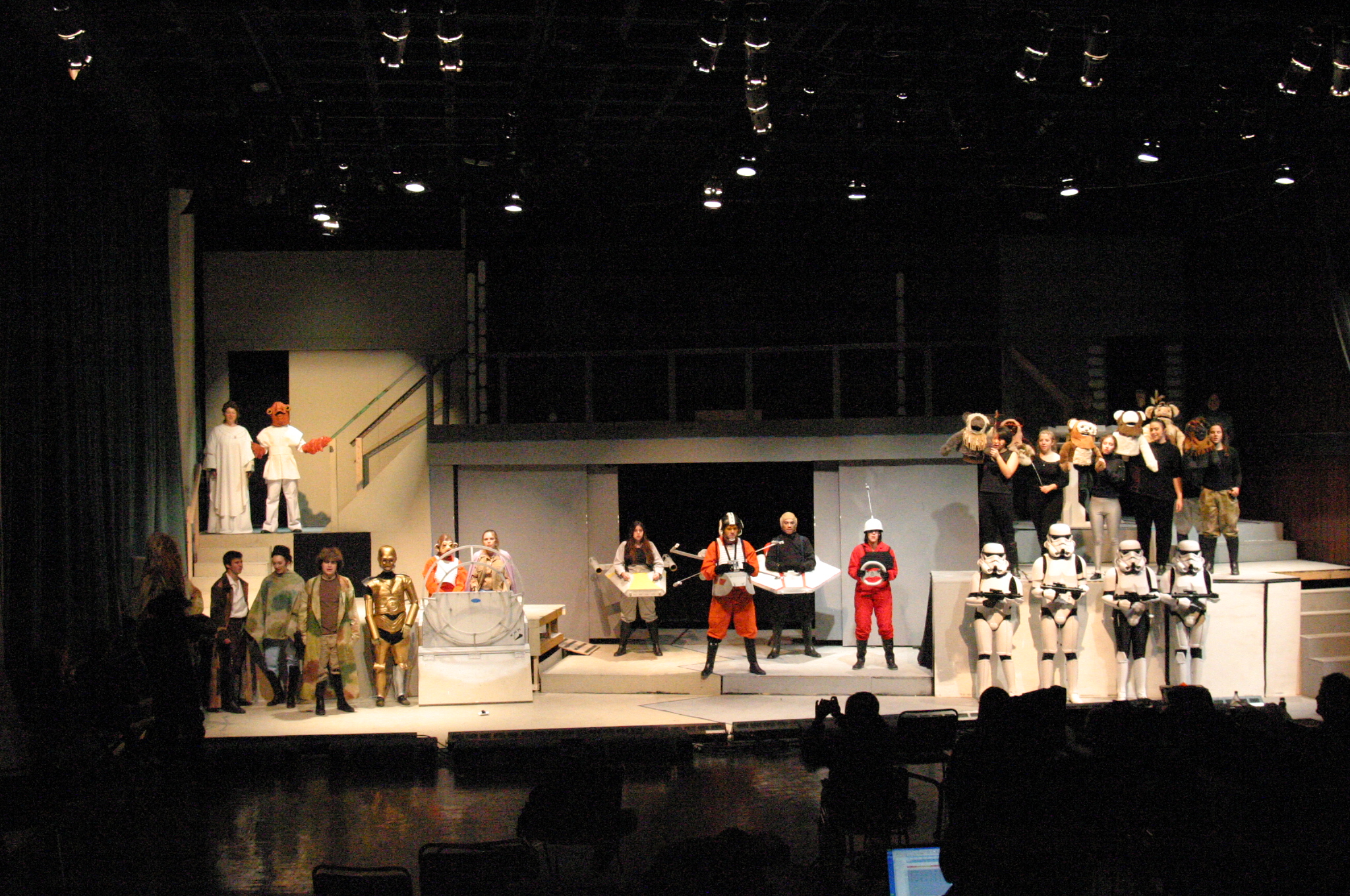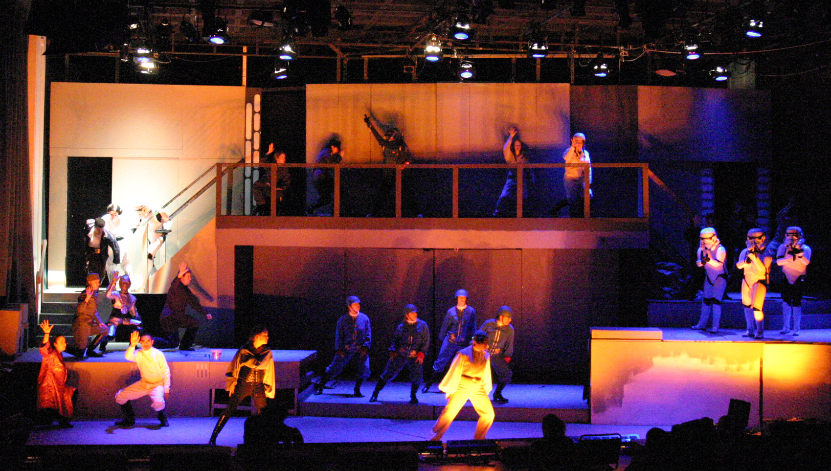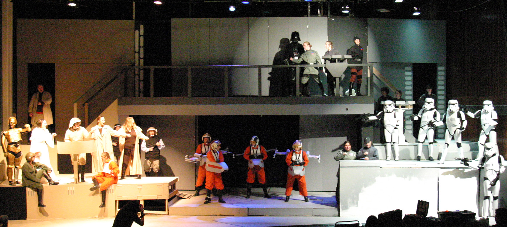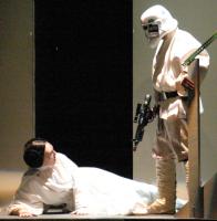 | George Lucas (co-creator Jeff Suess) and Luke Skywalker (Matt Ciborowski '08) plan for the evening's festivities in 'Trilogy Tonight.' (credit: Jax Kirtley) They've got your force right here. The Force Fugue sung by Han Solo (Timothy Abrahamsen '06), Luke Skywalker (Matt Ciborowski '08), and Obi-Wan Kenobi (David Jedlinsky '89). (credit: Jax Kirtley) The Imperial Stormtrooper Tap Corps (Kenny Kamrin G, Janet Lieberman '07, Caitlin Shindler '03, Kelly Rockwell '09) holds their 'Vader's Angels' pose. (credit: Jax Kirtley) In a Quintet-style throw-down, the Rebels and Imperials prepare to face off in the "Death Star Assault Medley". (credit: Jax Kirtley) Imperial walkers lumber towards the Rebel base as Luke (Matt Ciborowski '08) and Wedge (Matt Stern '08) attempt to shoot them down in "The Battle of Hoth". (credit: Jax Kirtley) Luke (Matt Ciborowski '08) wishes to rush to save his friends, but is warned off by Yoda (Kenny Kamrin G) and the spirit of Obi-wan (David Jedlinsky '90) in "Light and Dark." (credit: Jax Kirtley) Darth Vader (Jamez Kirtley '94) tempts Luke (Matt Ciborowski '08) to the dark side during their duel in "Music of the Dark Knight." (credit: Jax Kirtley) Jabba (voice Rob Morrison '96, puppeteer Jamez Kirtley '94) orders the heroes to be thrown into the pit of Carkoon, the resting place of the Almighty Sarlaac. (credit: Jax Kirtley) Imperials prepare for a "Rebel Raid", led by Emperor Palpatine (Bill Andrews G, center), Vader (Jamez Kirtley '94), Captain Exposition (Michelle Fogerson '07, left center), Captain Needa (Elizabeth Zakszewski '06, left) and Admiral Ozzel (Dawn Erickson '07, right). (credit: Jax Kirtley) Vader (Jamez Kirtley '94) stalks the throne room in search of Luke while the Emperor (Bill Andrews G) eggs Luke towards the dark side. (credit: Jax Kirtley) George (Jeff Suess) and the cast wrap up the show: "Prequels tomorrow, Trilogy Tonight!" (credit: Jax Kirtley) | Luke (Matt Ciborowski '08) argues West Side Story-style with his Uncle Owen (Rob Morrison '96) about the merits of living on "Tatooine." (credit: Jax Kirtley) Han (Timothy Abrahamsen '06), Chewie (Edmund Golaski '99), Obi-wan (David Jedlinsky '90), and Luke (Matt Ciborowski '08) contemplate the meaning of a passing Imperial fighter. (credit: Jax Kirtley) Luke Skywalker (Matt Ciborowski '08) comes to rescue Leia (Allison Volk W'09) from her cell on the Death Star. (credit: Jax Kirtley) Leia (Allison Volk W'09) argues with Han (Timothy Abrahamsen '06) about their intentions towards one another while Luke (Matt Ciborowski '08) gets very uncomfortable and Threepio (Eleanor 'Nori' Pritchard '06), Chewbacca (Edmund Golaski '99), and 2-1B (Sarah Slotznick '09) look on. (credit: Jax Kirtley) Luke (Matt Ciborowski '08) feels like he and Artoo (voiced by Stephen Peters G) are being watched by Yoda (Kenny Kamrin G). (credit: Jax Kirtley) Lando's (Nicolina Akraboff '07, third from left) luck takes a turn for the worse, but all that and more can happen in "One Night in Bespin." (credit: Jax Kirtley) 8876 (credit: Jax Kirtley) Leia (Allison Volk W'09) sits at the tail of Jabba the Hutt (Jabba Puppet by The Big Nazo, Providence, RI). (credit: Jax Kirtley) Threepio (Eleanor 'Nori' Pritchard '06) tells Chief Chirpa (Sue Swalley) and the rest of the Ewoks the heroes' tale of struggle and rebellion. (credit: Jax Kirtley) "At LAAAAAAAAAAAAAST, the Shield is down!" Admiral Ackbar (Ryan Hendrickson '07) celebrates with Mon Mothma (Kristin Hughes) as the Death Star's shield goes down and the fighters (Allison Linker W'05) are free to attack. (credit: Jax Kirtley) | Stormtroopers are not the only ones invading the Mos Eisley Cantina. E.T. (Sarah Slotznick '09) is on the balcony, Dr. Who (Brian Pepper '08) and companion Leyla (Caitlin Shindler '03) are near the stairs, a pair of Thermians from Galaxy Quest (Matt Stern '08, Sally Peach '09) dance near the band, and just out of view to the left is Jayne from Firefly. (credit: Jax Kirtley) Nothing Like A Name (from Nothing Like A Dame, South Pacific). Tapdancing Stormtroopers: Kenny Kamrin G, Janet Lieberman '07, Caitlin Shindler '03, and Kelly Rockwell '09 (credit: Jax Kirtley) Obi-wan (David Jedlinsky '90) and Vader (Jamez Kirtley '94) have their final confrontation. (credit: Jax Kirtley) General Veers (Ryan Hendrickson '07) makes the mistake of disturbing Lord Vader (Jamez Kirtley '94) in his meditation chamber. (credit: Jax Kirtley) Han (Timothy Abrahamsen '06) leads Leia (Allison Volk w'09) in a cat-and-mouse tango chase around the Falcon. (credit: Jax Kirtley) Boba Fett (Kenny Kamrin G) preps the frozen Han Solo from transport, assisted by a pair of Bespin Guards (Dawn Erickson '07, Kristin Hughes). (credit: Jax Kirtley) Princess Leia (Allison Volk w'09) disguises herself as the bounty hunter Boussh, selling her prisoner out to the Mighty Jabba in "Mr. Chewbacca" (Edmund Golaski '99). (credit: Jax Kirtley) With the death of Yoda, Obi-wan (David Jedlinsky '90) is forced to tell Luke (Matt Ciborowski '08) the truth about his father in "Anakin." (credit: Jax Kirtley) The Rebels are captured trying to sabotage the bunker, all part of the Emperor's "Endorgame." (credit: Jax Kirtley) Starfighters lead by Lando (Nicolina Akraboff '07, in the Millenium Falcon) and Wedge (Matt Stern '08, center) escape the exploding Death Star while Rebels and Ewoks celebrate. (credit: Jax Kirtley) |