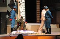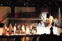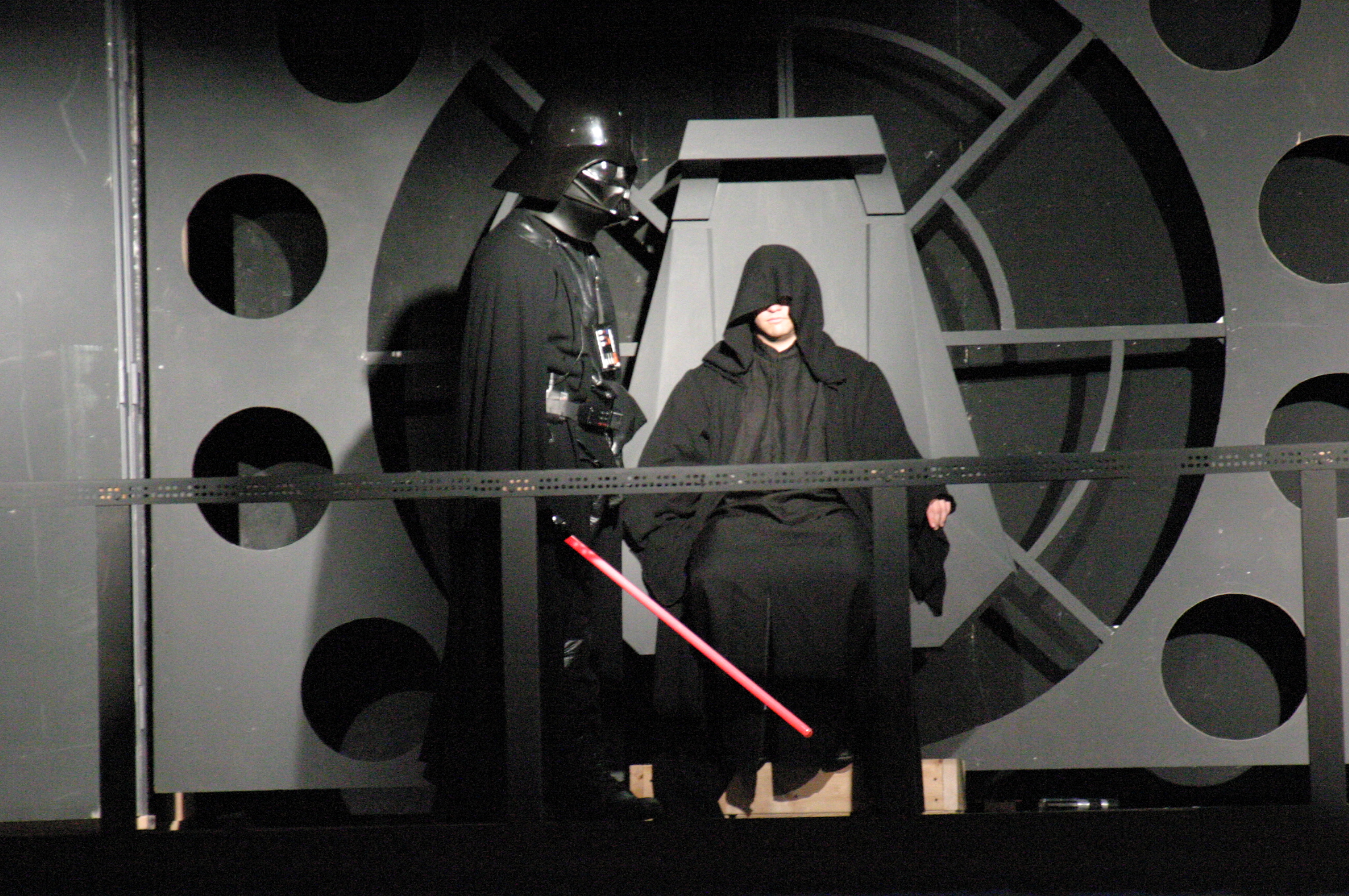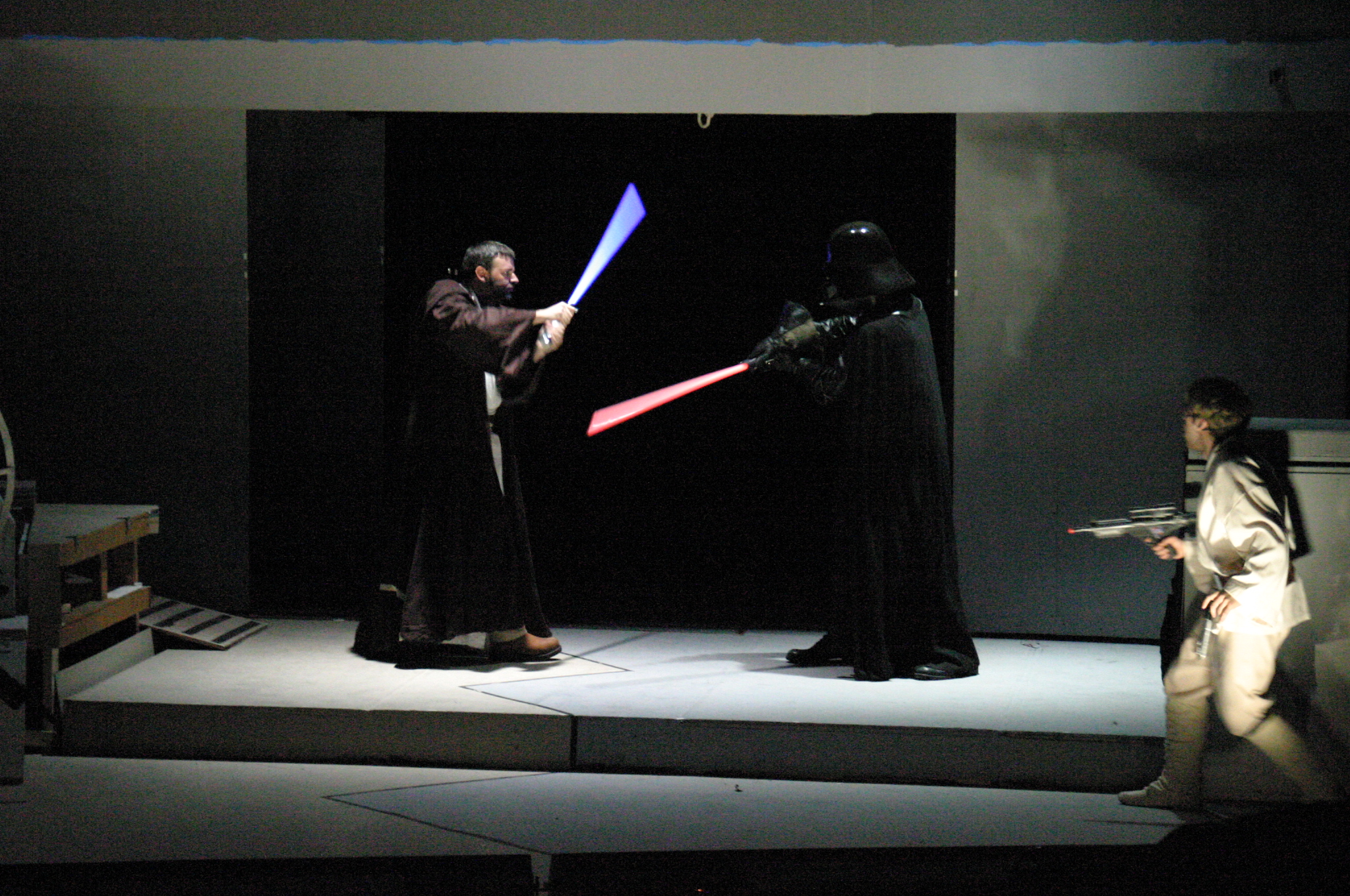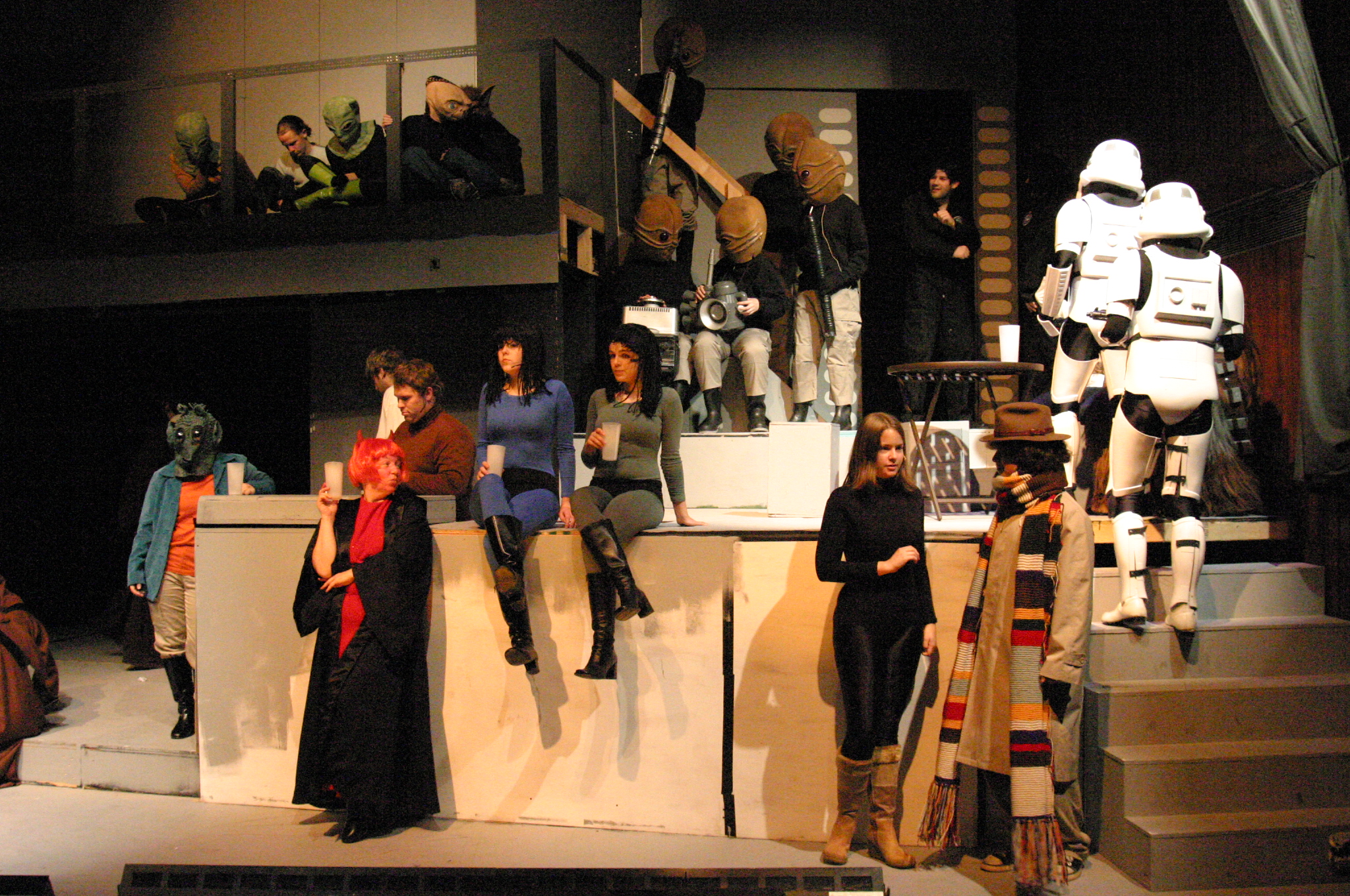 | George Lucas (co-creator Jeff Suess) and Luke Skywalker (Matt Ciborowski '08) plan for the evening's festivities in 'Trilogy Tonight.' (credit: Jax Kirtley) They've got your force right here. The Force Fugue sung by Han Solo (Timothy Abrahamsen '06), Luke Skywalker (Matt Ciborowski '08), and Obi-Wan Kenobi (David Jedlinsky '89). (credit: Jax Kirtley) The Imperial Stormtrooper Tap Corps (Kenny Kamrin G, Janet Lieberman '07, Caitlin Shindler '03, Kelly Rockwell '09) holds their 'Vader's Angels' pose. (credit: Jax Kirtley) In a Quintet-style throw-down, the Rebels and Imperials prepare to face off in the "Death Star Assault Medley". (credit: Jax Kirtley) Imperial walkers lumber towards the Rebel base as Luke (Matt Ciborowski '08) and Wedge (Matt Stern '08) attempt to shoot them down in "The Battle of Hoth". (credit: Jax Kirtley) Luke (Matt Ciborowski '08) wishes to rush to save his friends, but is warned off by Yoda (Kenny Kamrin G) and the spirit of Obi-wan (David Jedlinsky '90) in "Light and Dark." (credit: Jax Kirtley) Darth Vader (Jamez Kirtley '94) tempts Luke (Matt Ciborowski '08) to the dark side during their duel in "Music of the Dark Knight." (credit: Jax Kirtley) Jabba (voice Rob Morrison '96, puppeteer Jamez Kirtley '94) orders the heroes to be thrown into the pit of Carkoon, the resting place of the Almighty Sarlaac. (credit: Jax Kirtley) Imperials prepare for a "Rebel Raid", led by Emperor Palpatine (Bill Andrews G, center), Vader (Jamez Kirtley '94), Captain Exposition (Michelle Fogerson '07, left center), Captain Needa (Elizabeth Zakszewski '06, left) and Admiral Ozzel (Dawn Erickson '07, right). (credit: Jax Kirtley) Vader (Jamez Kirtley '94) stalks the throne room in search of Luke while the Emperor (Bill Andrews G) eggs Luke towards the dark side. (credit: Jax Kirtley) George (Jeff Suess) and the cast wrap up the show: "Prequels tomorrow, Trilogy Tonight!" (credit: Jax Kirtley) | Luke (Matt Ciborowski '08) argues West Side Story-style with his Uncle Owen (Rob Morrison '96) about the merits of living on "Tatooine." (credit: Jax Kirtley) Han (Timothy Abrahamsen '06), Chewie (Edmund Golaski '99), Obi-wan (David Jedlinsky '90), and Luke (Matt Ciborowski '08) contemplate the meaning of a passing Imperial fighter. (credit: Jax Kirtley) Luke Skywalker (Matt Ciborowski '08) comes to rescue Leia (Allison Volk W'09) from her cell on the Death Star. (credit: Jax Kirtley) Leia (Allison Volk W'09) argues with Han (Timothy Abrahamsen '06) about their intentions towards one another while Luke (Matt Ciborowski '08) gets very uncomfortable and Threepio (Eleanor 'Nori' Pritchard '06), Chewbacca (Edmund Golaski '99), and 2-1B (Sarah Slotznick '09) look on. (credit: Jax Kirtley) Luke (Matt Ciborowski '08) feels like he and Artoo (voiced by Stephen Peters G) are being watched by Yoda (Kenny Kamrin G). (credit: Jax Kirtley) Lando's (Nicolina Akraboff '07, third from left) luck takes a turn for the worse, but all that and more can happen in "One Night in Bespin." (credit: Jax Kirtley) 8876 (credit: Jax Kirtley) Leia (Allison Volk W'09) sits at the tail of Jabba the Hutt (Jabba Puppet by The Big Nazo, Providence, RI). (credit: Jax Kirtley) Threepio (Eleanor 'Nori' Pritchard '06) tells Chief Chirpa (Sue Swalley) and the rest of the Ewoks the heroes' tale of struggle and rebellion. (credit: Jax Kirtley) "At LAAAAAAAAAAAAAST, the Shield is down!" Admiral Ackbar (Ryan Hendrickson '07) celebrates with Mon Mothma (Kristin Hughes) as the Death Star's shield goes down and the fighters (Allison Linker W'05) are free to attack. (credit: Jax Kirtley) | Stormtroopers are not the only ones invading the Mos Eisley Cantina. E.T. (Sarah Slotznick '09) is on the balcony, Dr. Who (Brian Pepper '08) and companion Leyla (Caitlin Shindler '03) are near the stairs, a pair of Thermians from Galaxy Quest (Matt Stern '08, Sally Peach '09) dance near the band, and just out of view to the left is Jayne from Firefly. (credit: Jax Kirtley) Nothing Like A Name (from Nothing Like A Dame, South Pacific). Tapdancing Stormtroopers: Kenny Kamrin G, Janet Lieberman '07, Caitlin Shindler '03, and Kelly Rockwell '09 (credit: Jax Kirtley) Obi-wan (David Jedlinsky '90) and Vader (Jamez Kirtley '94) have their final confrontation. (credit: Jax Kirtley) General Veers (Ryan Hendrickson '07) makes the mistake of disturbing Lord Vader (Jamez Kirtley '94) in his meditation chamber. (credit: Jax Kirtley) Han (Timothy Abrahamsen '06) leads Leia (Allison Volk w'09) in a cat-and-mouse tango chase around the Falcon. (credit: Jax Kirtley) Boba Fett (Kenny Kamrin G) preps the frozen Han Solo from transport, assisted by a pair of Bespin Guards (Dawn Erickson '07, Kristin Hughes). (credit: Jax Kirtley) Princess Leia (Allison Volk w'09) disguises herself as the bounty hunter Boussh, selling her prisoner out to the Mighty Jabba in "Mr. Chewbacca" (Edmund Golaski '99). (credit: Jax Kirtley) With the death of Yoda, Obi-wan (David Jedlinsky '90) is forced to tell Luke (Matt Ciborowski '08) the truth about his father in "Anakin." (credit: Jax Kirtley) The Rebels are captured trying to sabotage the bunker, all part of the Emperor's "Endorgame." (credit: Jax Kirtley) Starfighters lead by Lando (Nicolina Akraboff '07, in the Millenium Falcon) and Wedge (Matt Stern '08, center) escape the exploding Death Star while Rebels and Ewoks celebrate. (credit: Jax Kirtley) |