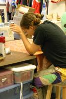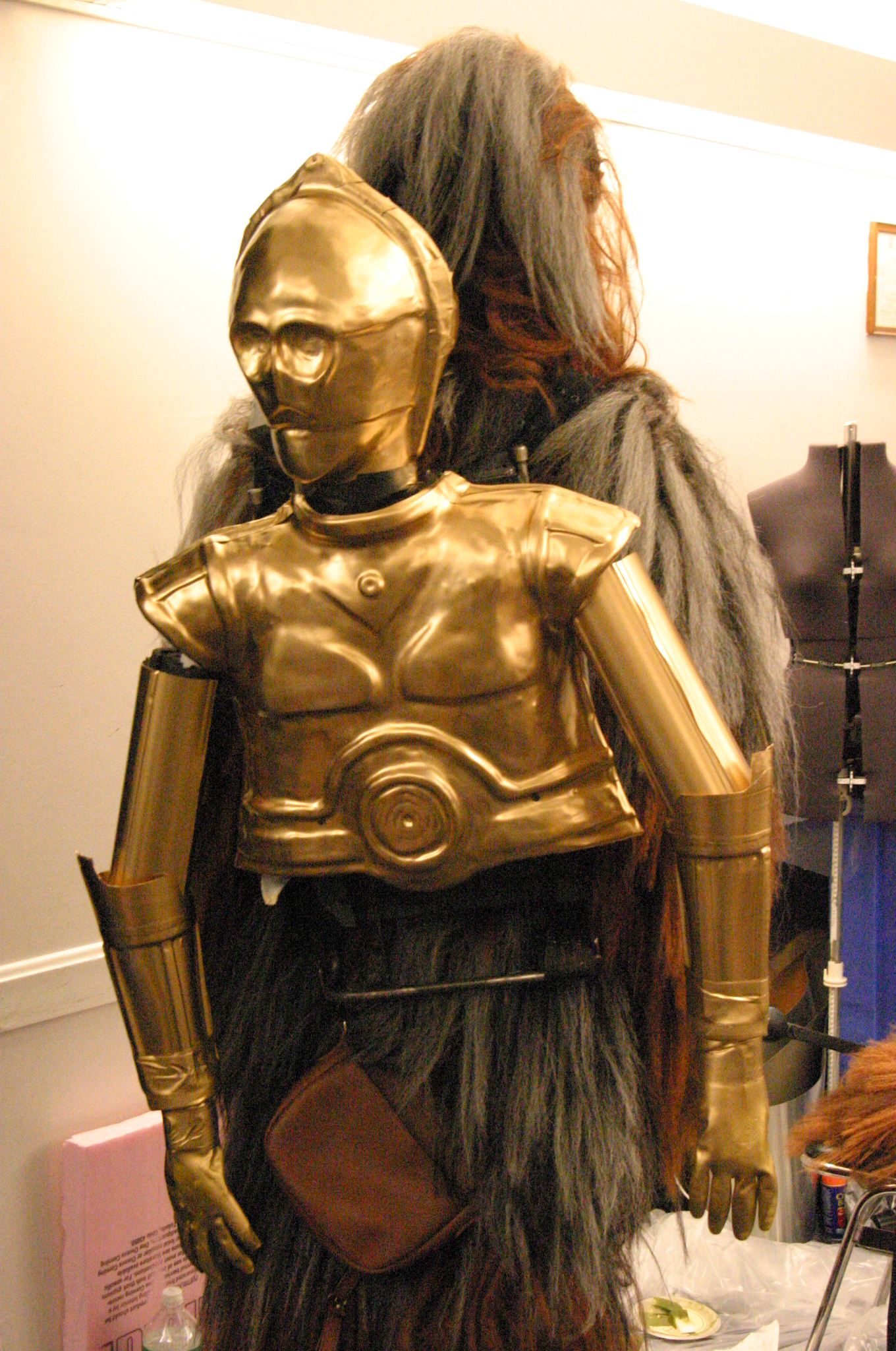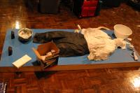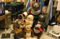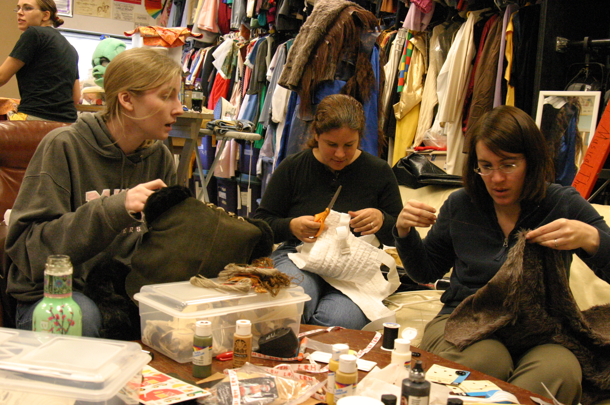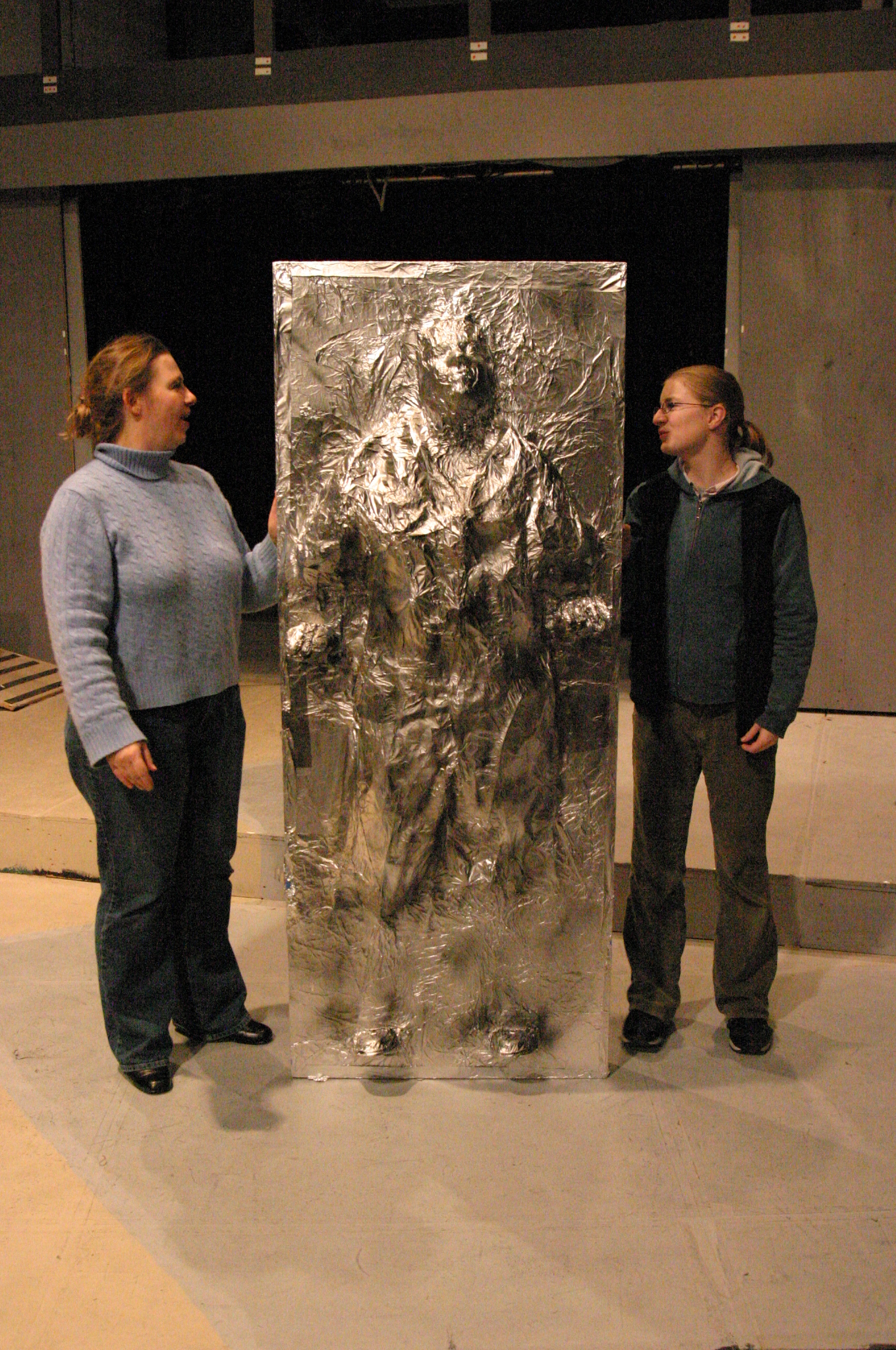 | Nikki Akraboff '07 does some detail fabric painting on the lining of Lando's cape. (credit: Jax Kirtley) Construction begins on the Han-Solo-frozen-in-carbonite prop (credit: Jax Kirtley) | Costume and puppet designer Nori Pritchard '06 supervises construction of Ewok puppets and rebel pilot flak vests by Ruth Jedlinsky and Sue Swalley. (credit: Jax Kirtley) Edmund Golaski '99 (Chewbacca) sports his shiny new C-3PO backpack for the Act V scenes where the droid is in pieces, and thus, can't be an actor. Cast from the same molds as the C-3PO costume, Edmund used his homemade vacuum-form machine to build both this prop and the droid costume. (credit: Jax Kirtley) | Nori Pritchard '06 is now apart of the tribe. Ironically, Nori, who designed the Ewoks and supervised their construction, also played C-3PO, whom the Ewoks worship as a god. (credit: Jax Kirtley) Props mistresses Kristin Hughes and Colleen Harty show off their finished product: Han Solo, frozen in carbonite. (credit: Jax Kirtley) |