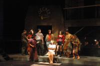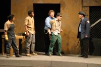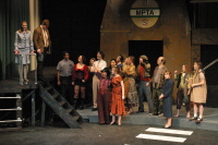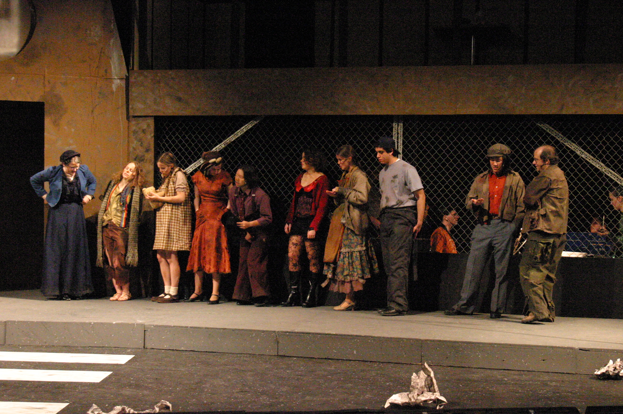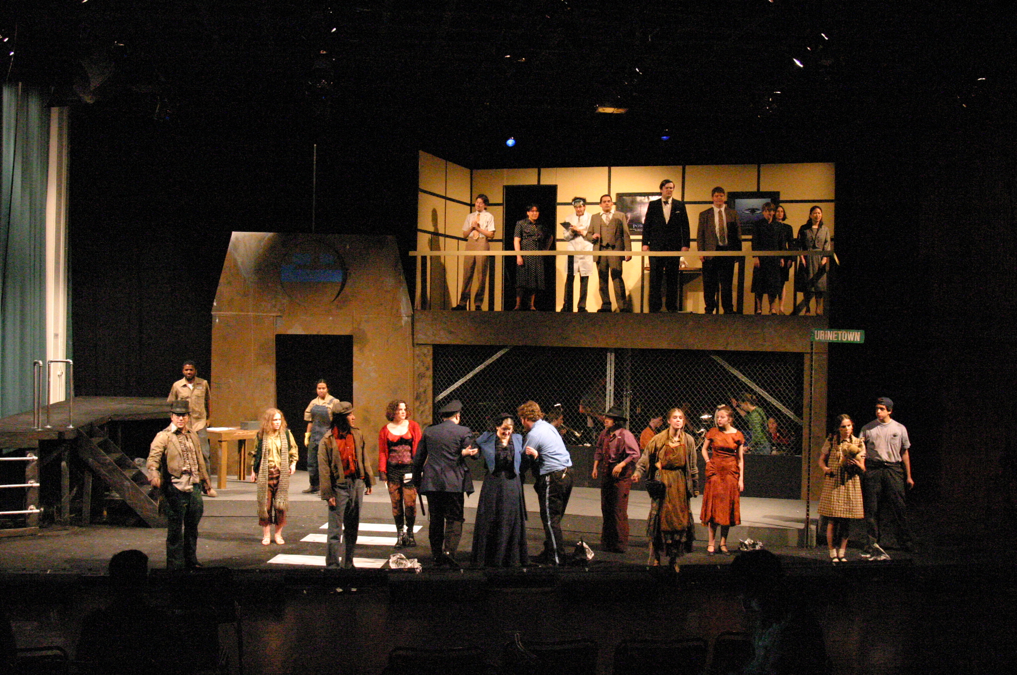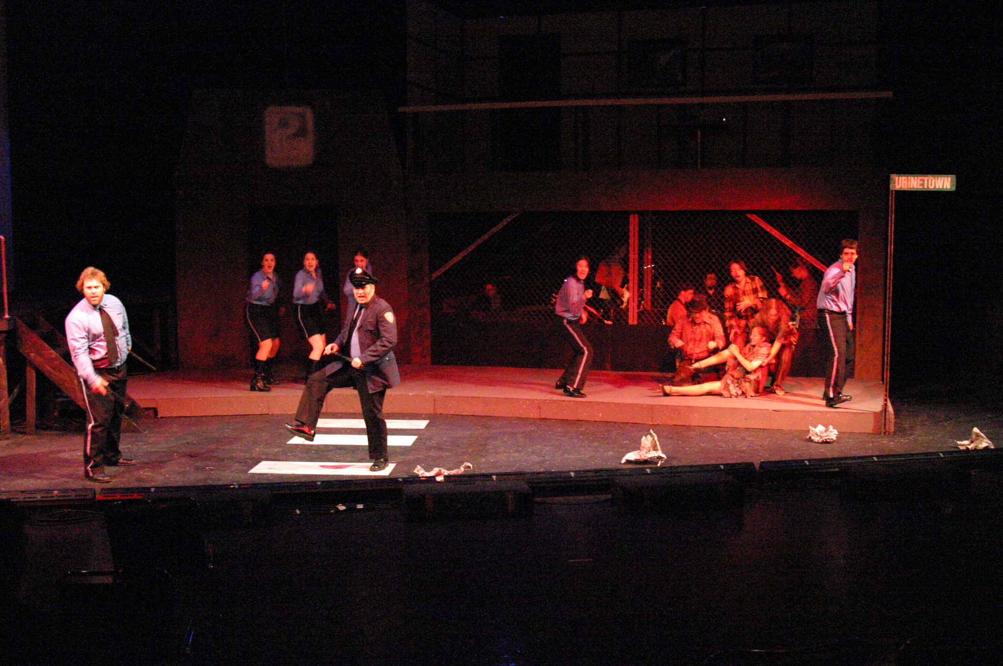 | The Urinetown orchestra (Carol Novitsky, percussion; Phillip Ilten, trombone; Jamez Kirtley, bass; Andrew Greenhut, reeds; Elliot Brandow, drums; Joanne Bruno, keyboard; Liz Zakszewski, conductor) (credit: Jax Kirtley) The Rich (Nori Pritchard, Matt Peairs, Pancho Vargas, Lori Huberman, Darrel Cain, Jackie Weber, Noe Kamelamela, Tim Rades, Maria Duaime) celebrate the marvel that is "Mister Cladwell." (credit: Jax Kirtley) Hope (Nori Pritchard) teaches Bobby (Steven Flowers) to "Follow Your Heart". (credit: Jax Kirtley) The Act One Finale (credit: Jax Kirtley) The Poor surround the captured Hope (Nori Pritchard) as they ask "What Is Urinetown?" (credit: Jax Kirtley) Ma Strong (Mary Linton Peters) leads the poor in the "Run Freedom Run", as Hope (Nori Pritchard) relaxes in a nearby chair. (credit: Jax Kirtley) Hope (Nori Pritchard) convinces the poor to spare her life. (credit: Jax Kirtley) Finale: "I See a River" (credit: Jax Kirtley) | "This is Urinetown." (credit: Jax Kirtley) "Cop Song" (Rob Morrison, Sally Peach, Caitlin Shindler, Kathleen McEnnis, Rogue Shindler, Lee-kai Wang, Stephen Peters, Danbee Kim, Kelly Rockwell, Elena Glassman, Carlos Cardenas) (credit: Jax Kirtley) The Poor (Mary Linton Peters, Elena Glassman, Nicolina Akraboff, Kelly Rockwell, Danbee Kim, Sally Peach, Kathleen McEnnis, Carlos Cardenas, Lee-kai Wang, Stephen Peters) line up to use the local public amenity. (credit: Jax Kirtley) The Rich prepare to quell the rebel uprising. (credit: Jax Kirtley) Little Sally (Nicolina Akraboff) looks on during the raucous "Snuff That Girl" (Kathleen McEnnis, Carlos Cardenas, Kelly Rockwell, Danbee Kim, Sally Peach, Lee-kai Wang) (credit: Jax Kirtley) Senator Fipp (Greg Lohman) confronts Caldwell Cladwell (Darrell Cain) as Caldwell's staff (Maria Duaime, Pancho Vargas, Noe Kamelamela) look on. (credit: Jax Kirtley) "We're Not Sorry" (credit: Jax Kirtley) | Old Man Strong (Stephen Peters, center) is restrained by Officer Barrel (Rob Morrison) as Ms. Pennywise (Koyel Bhattacharyya), Bobby (Steven Flowers) and Officer Lockstock (Rogue Shindler) watch. (credit: Jax Kirtley) Little Sally (Nicolina Akraboff) gives Officer Lockstock (Rogue Shindler) a lesson in elementary hydraulics. (credit: Jax Kirtley) Officer Barrell (Rob Morrison), Hope (Nori Pritchard), and Officer Lockstock (Rogue Shindler) look on as Ms. Pennywise (Koyel Bhattacharyya) confronts Caldwell Cladwell (Darrell Cain) and Mr. McQueen (Tim Rades). (credit: Jax Kirtley) Bobby (Steven Flowers) leads the downtrodden poor in an open revolt. (credit: Jax Kirtley) Little Sally (Nicolina Akraboff) looks on during the raucous "Snuff That Girl" (Kathleen McEnnis, Carlos Cardenas, Danbee Kim, Kelly Rockwell, Sally Peach, Lee-kai Wang) (credit: Jax Kirtley) Barrell (Rob Morrison) and Lockstock (Rogue Shindler) prepare to cart Bobby (Steven Flowers) off to Urinetown. (credit: Jax Kirtley) The Poor celebrate in front of the Bobby Strong Memorial Toilet Authority. (credit: Jax Kirtley) |