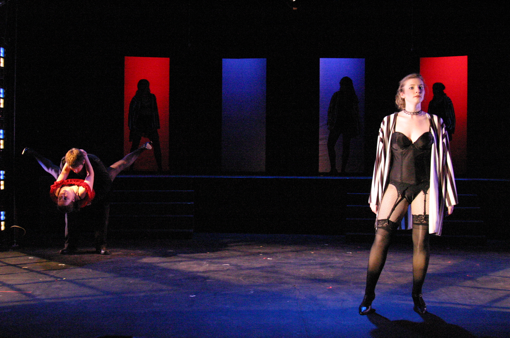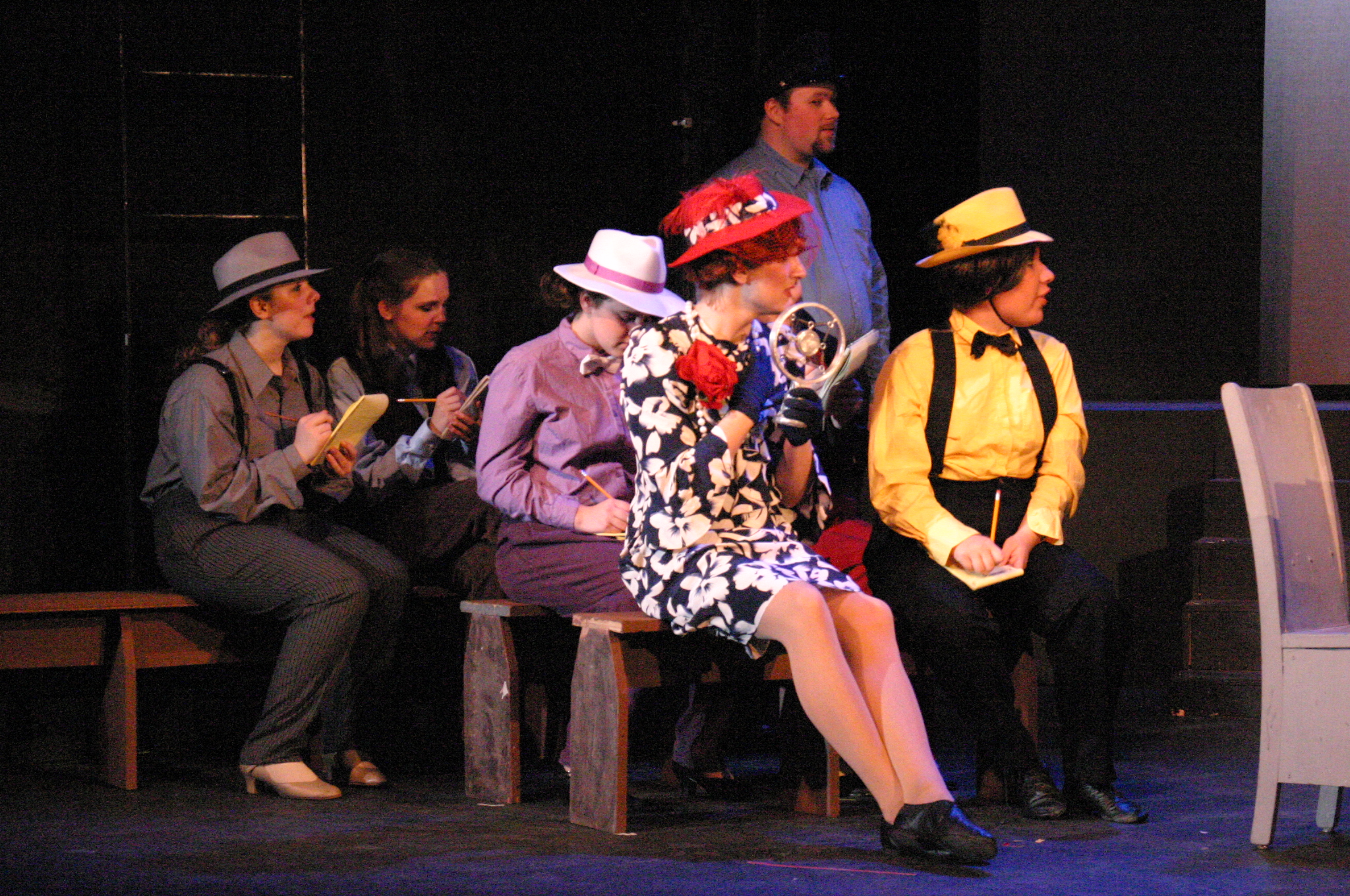 | Velma Kelley (Nori Pritchard) in "All That Jazz" (credit: Jax Kirtley) "Number 17 -- The Spread Eagle": Sally Peach, Matt Stern, and Nori Pritchard (credit: Jax Kirtley) "All I Care About is Love": Billy Flynn (Matthew Ciborowski) surrounded by his chorus (Gabrielle Abousleman, Nikki Akraboff, Sally Peach, Amanda Giermann, Kelsey Contreras, Amelia Thomas, Dawn Erickson, Krista Sergi) (credit: Jax Kirtley) Roxie and her crack medical team of doctors and nurses (from left: Milo Martinez, J. Michael Spencer, Isa de Castro, Matt Maranda, Carlos Cardenas, Edmund Golaski) in "My Baby and Me" (credit: Jax Kirtley) "Razzle Dazzle" (credit: Jax Kirtley) Velma and Mama (Nori Pritchard and Michelle Fogerson) listen to Roxie's trial and comment on the lack of "Class" (credit: Jax Kirtley) | Murderess Anne (Amelia Thomas, right) describes her unfaithful husband (Milo Martinez) in the "Cell Block Tango" (credit: Jax Kirtley) "Cell Block Tango": Gabrielle Abousleman, Sally Peach, Kelsey Contreras, Amanda Giermann, Nori Pritchard, Krista Sergi, Nikki Akraboff, Dawn Erickson, Amelia Thomas (credit: Jax Kirtley) Billy and Roxie (Matthew Ciborowski, Isa de Castro, center) hold a press conference in "Both Reached for the Gun" (credit: Jax Kirtley) Amos (Greg Lohman) is "Mister Cellophane" (credit: Jax Kirtley) The audience of reporters at Roxie's trial (from left: Krista Sergi, Nikki Akraboff, Sally Peach, Thom Dancy, J. Michael Spencer, Dawn Erickson) (credit: Jax Kirtley) Mary Sunshine (Thom Dancy) (credit: Jax Kirtley) | Murderess June (Dawn Erickson) in the "Cell Block Tango" (credit: Jax Kirtley) Amos (Greg Lohman) confronts his wife Roxie (Isa de Castro) during a tap dance (Thom Dancy, Milo Martinez) (credit: Jax Kirtley) Roxie (Isa de Castro, seated) reveals a shocking truth to a crowd of reporters and an annoyed Velma (Nori Pritchard, right) (credit: Jax Kirtley) Billy (Matthew Ciborowski) and Roxie (Isa de Castro) face off before her trial (credit: Jax Kirtley) Roxie (Isa de Castro) indicates an important piece of evidence in her trial while the jury (Milo Martinez) and bailiff (Carlos Cardenas) look on. (credit: Jax Kirtley) Velma and Roxie (Nori Pritchard and Isa de Castro) performing the "Hot Honey Rag" (credit: Jax Kirtley) |