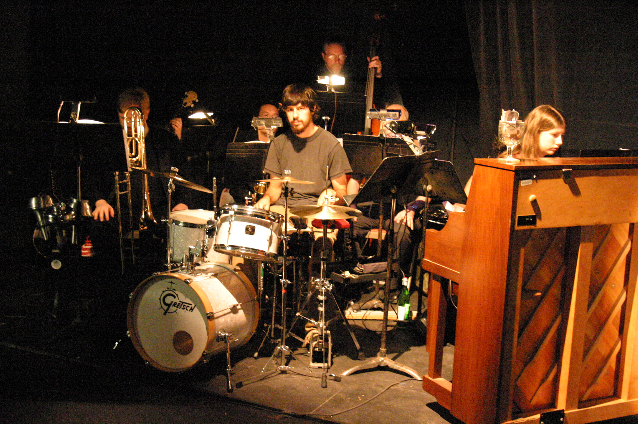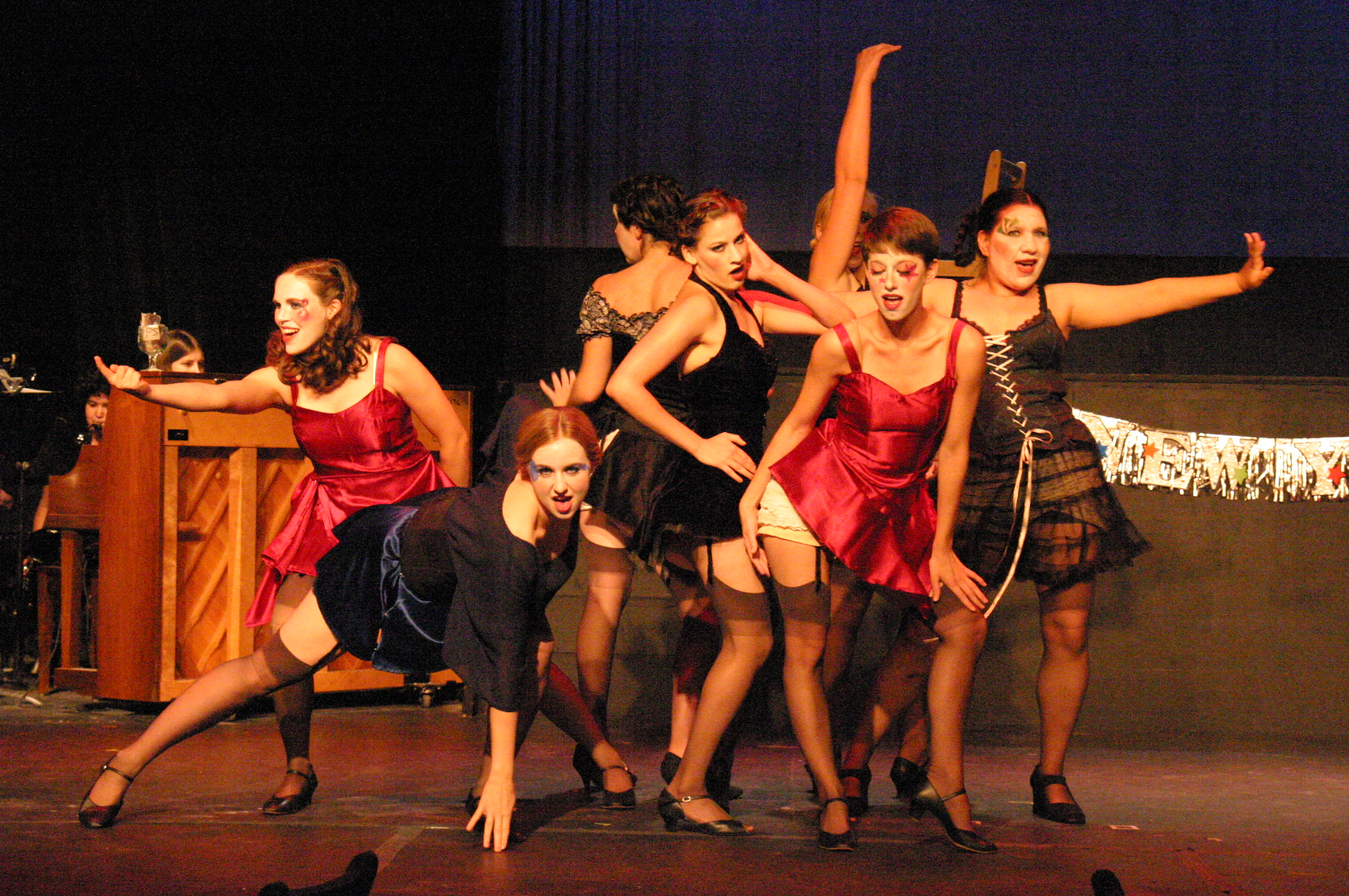 | The orchestra: Bethany Aiken (Music Director/Piano), Aaron Chow G (Clarinet/Alto Saxophone/ Flute), Ian Cohen (Clarinet), Cristina Thomas G (Tenor Saxophone), Bill Sommerfeld '88 (Trombone), Wayne Wylupski (Guitar/Banjo), Brian Ott (Bass), and Mike Tucker (Percussion). (credit: Jax Kirtley '96) J. Michael Spencer and Barry Kudrowitz G, Welcome to Berlin (credit: Jax Kirtley '96) from left to right: Nicolina Akraboff '07, Lauren McLendon '08, Michelle Fogerson '07, Mia Shandell '10, Becky Millson '09, Katherine Redfield '09 , Dawn Erickson '07 in Don't Tell Mamma (credit: Jax Kirtley '96) Mia Shandell '10 and Barry Kudrowitz G in Perfectly Marvelous (credit: Jax Kirtley '96) | Carlos Cardenas '09 in Wilkommen (credit: Jax Kirtley '96) Barry Kudrowitz G and Elvie Stephanopolous '07 in So What? (credit: Jax Kirtley '96) Joe Hunt, Milo Martinez '08, Becky Millson '09 in the Kit Kat Klub (credit: Jax Kirtley '96) Elvie Stephanopolous '07 and Edmund Golaski '99 in It Couldn't Please Me More (credit: \ Jax Kirtley '96) | From left to right: Lori Huberman '07, Luis Loya '06, Dawn Erickson '07, Ben Schwartz '06, Milo Martinez '08, Joe Hunt, Carrie Ann Lee '10, Matt Spencer MEng, Carlos Cardenas '09, Darrell Cain '08, Lauren McLendon '08, Holly Laird '07, Michelle Fogerson '07, Becky Millson '09, Nicolina Akraboff '07, Katherine Redfield '09 with J. Michael Spencer visible front left. (credit: Jax Kirtley '96) Mia Shandell '10 in Don't Tell Mamma (credit: Jax Kirtley '96) Mia Shandell '10 and Barry Kudrowitz G in the Kit Kat Klub (credit: Jax Kirtley '96) Carrie Ann Lee '10 and Edmund Golaski '99 (credit: Jax Kirtley '96) |