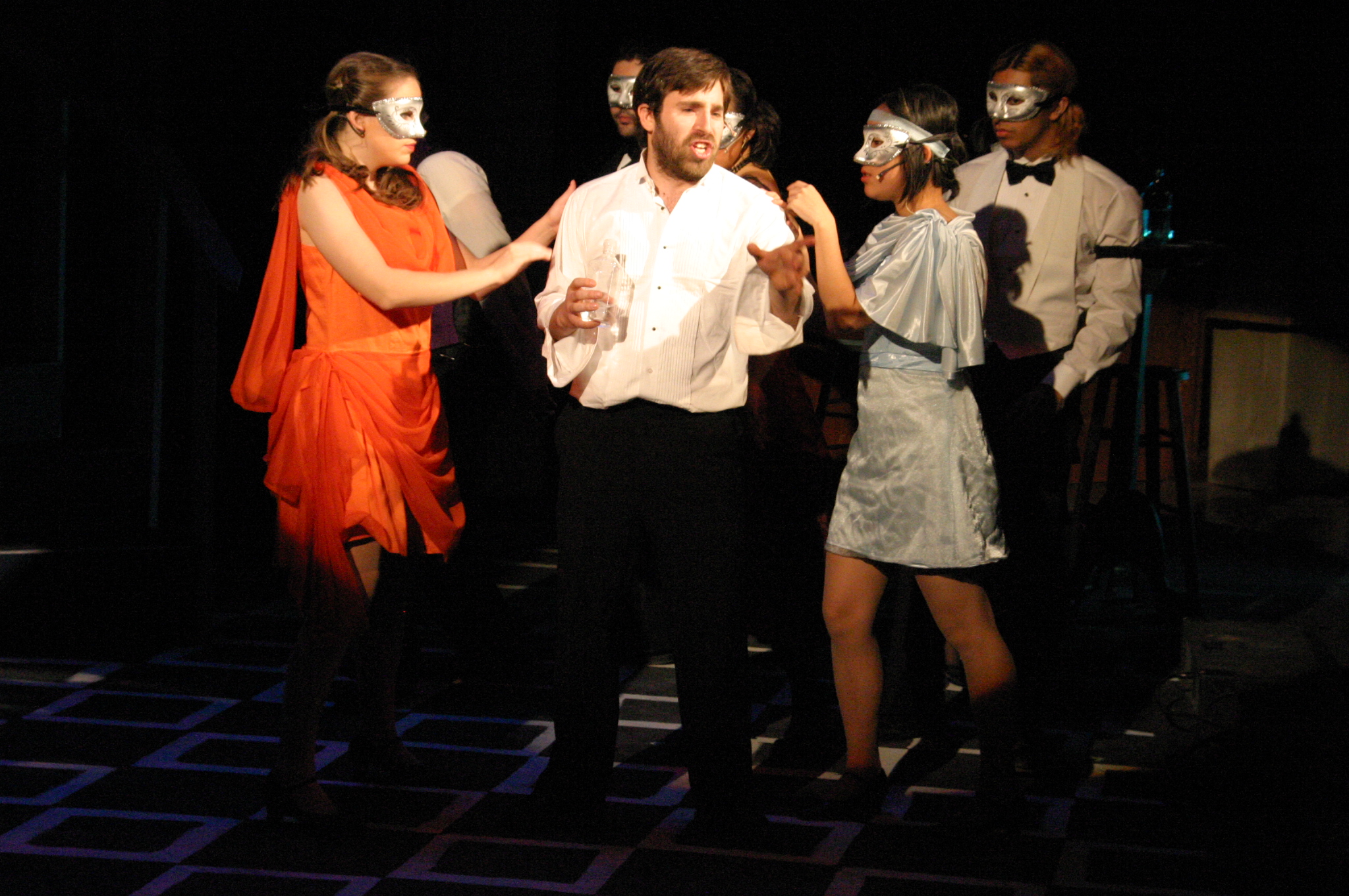 | Queenie Was a Blond: Queenie (Carrie A. Lee'10) (credit: Jax Kirtley) Raise the Roof: Dolores, Mae, Gold, Queenie, Burrs, Sam (Karen Wong '10 ,Nicolina Akrahoff '07, Luis Loya '06, Carrie A. Lee '10, Matthew Cibborowski '08, Matt Peairs '09) (credit: Jax Kirtley) Intro to Scene 5 (credit: Jax Kirtley) The Life of the Party: Kate (Danbee Kim '09) (credit: Jax Kirtley) Let me Drown: (Nicolina Akrahoff '07, Matthew Cibborowski '08, Elise Kuo '11 ) (credit: Jax Kirtley) How did it come to this: Queenie, Burrs (Carrie A. Lee '10 and Matthew Cibborowski '08) (credit: Jax Kirtley) | Queenie Was a Blond: Queenie (Carrie A. Lee'10) and the men (Dave Berger, Matt Stern '08, Carlos Cardenas '09, Luis C. Loya '06, Estevan Milo Martinez '08, Darrell Cain '08, Matt Peairs '09) (credit: Jax Kirtley) Poor Child: Kate, Black, Burrs, Queenie (Danbee Kim '09, Matt Stern '08, Matthew Cibborowski '08, Carrie A. Lee '10) (credit: Jax Kirtley) Two of a Kind: Eddie and Mae (Darrell Cain '08 and Nicolina Akrahoff '07) (credit: Jax Kirtley) After Life (credit: Jax Kirtley) Come with Me: foreground: Queenie and Black (Carrie A. Lee'10 and Matt Stern '08) (credit: Jax Kirtley) How did it come to this: Queenie (Carrie A. Lee'10) (credit: Jax Kirtley) | Apartment: Queenie (Carrie A. Lee '10), Burrs (Matthew Cibborowski '08), Ensemble (Balcony L to R: Luis C. Loya '06, Darrell Cain '08, Nicolina Akrahoff '07, Estevan Milo Martinez '08, Helen O'Keefe '09, Dave Berger, Carlos Cardenas '09, Matt Peairs '09, Karen Hart '11, Karen Wong '10, Krista Sergi) (credit: Jax Kirtley) An Old Fashioned Love Story: Madeline True (Krista Sergi) (credit: Jax Kirtley) What is it about her: Kate and Burrs (Danbee Kim '09 and Matthew Cibborowski '08) (credit: Jax Kirtley) Let me Drown: Burrs (Matthew Cibborowski '08) (credit: Jax Kirtley) Make me Happy: Black, Burrs, Queenie (Matt Stern '08, Matthew Cibborowski '08, and Carrie A. Lee'10) (credit: Jax Kirtley) Orchestra (credit: Jax Kirtley) |
