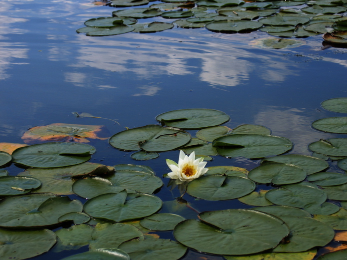 Wider view of all the lily pads, showing the clouds, but very little trash.
