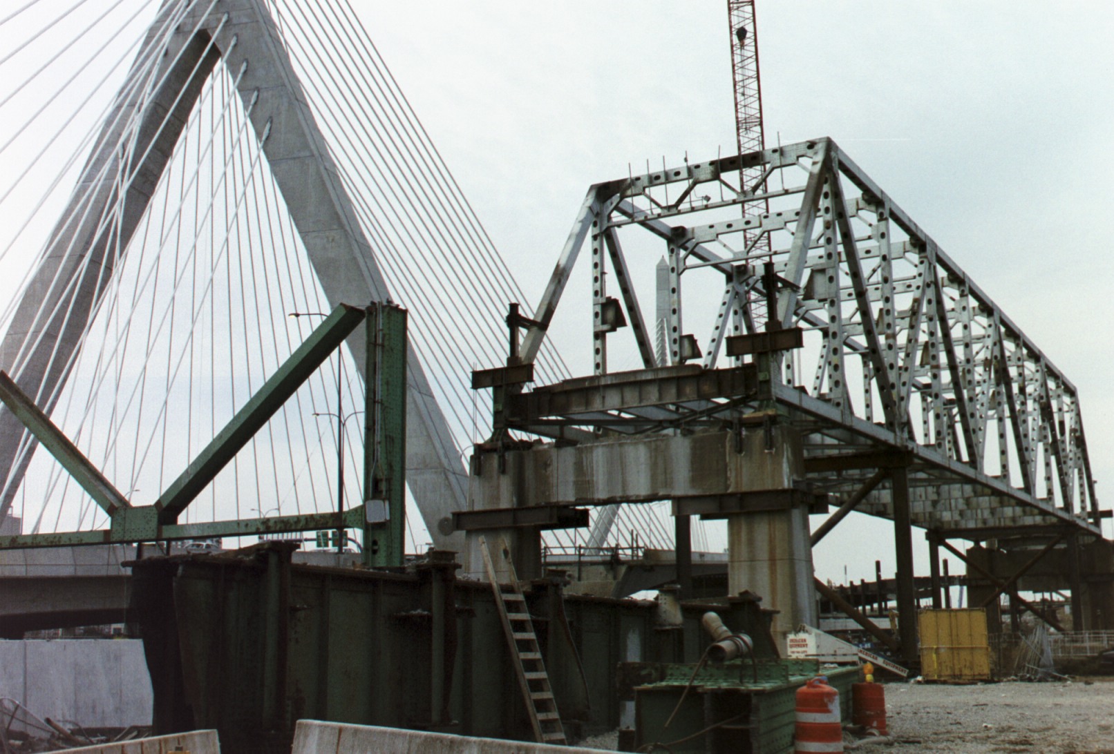 The old bridge over the Charles remains as just a frame. The southbound lanes ran on the bottom of the bridge; the northbound lanes ran on a middle level that has been removed.