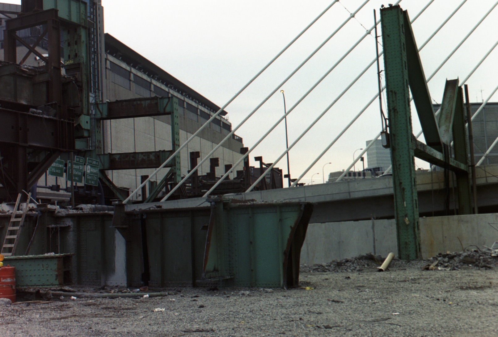 93 emerges from the ground to climb up on to the Zakim bridge. Bits of the old elevated still remain, including some large chunks of metal lying on the ground.