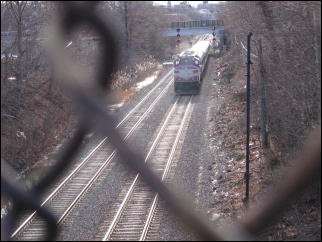 An inbound MBTA commuter rail train passes an "approach medium" signal as it approaches the Cedar Street bridge.