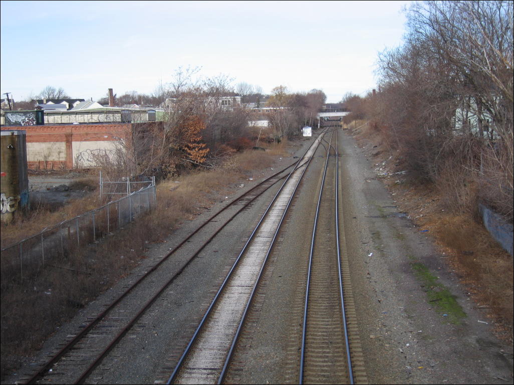 Description : The commuter rail narrows from three tracks to two headed north out of Somerville. The leftmost track is a largely unused freight track; the two tracks on the right carry MBTA commuter rail and the Amtrak Downeaster.