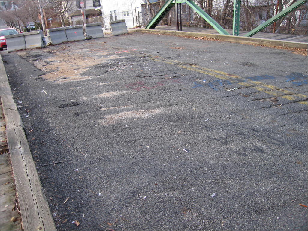 The bridge is closed because it is decaying badly. The pavement is cracking; in some places wood can be seen beneath asphalt.