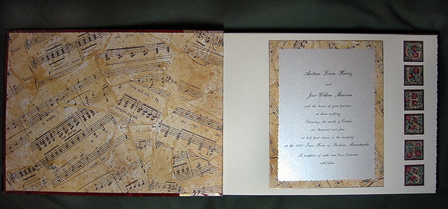 The paper lining the insides of the covers is scrapbook paper with a design of torn up bit of musical scores (in honor of their interest in music and singing). The first page has a copy of the invitation and G U E S T S down the side in ornate letters. |
