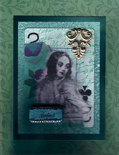 I didn't remember to take a picture of my creation before I pacakged it up, but Sandy took a picture when she got it. I called it "The Keys to the Kingdom." It has a castle from one of the Stampsmith Medieval sheets and one of her Medieval tiles on the box. The box has been painted with blue & green lumieres before stamping. Here it is: