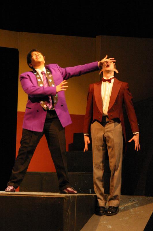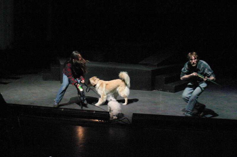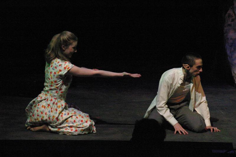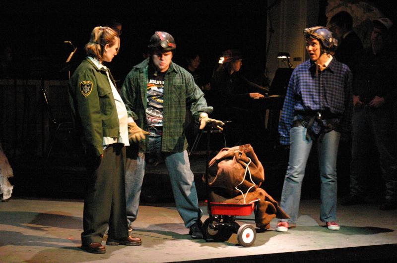 The Deputy (Joe Lowery, left) and Sheriff (Welkin Pope, green jacket) hand the Bat Boy (David Poland, in bag) to Shelley (Nori Pritchard) and Meredith (ML Peters, right). (credit: Jax Kirtley) Dr. Parker (Paul Giragos) reminisces with Meredith (ML Peters). (credit: Jax Kirtley) Meredith (ML Peters) teaches Edgar the Bat Boy (David Poland) to read. (credit: Jax Kirtley) The townspeople make "A Joyful Noise". (credit: Jax Kirtley) Dawn Erickson and Todd Radford take their vicious hunting dogs Muffin (as herself) and Mr. Princess Snugglebutt (Siris) on a hunt for the Bat Boy. (credit: Jax Kirtley) Edgar (David Poland) makes an "Apology to a Cow". (credit: Jax Kirtley) Shelley (Nori Pritchard, kneeling) comforts Edgar (David Poland) after the death of her parents. (credit: Jax Kirtley) DZ and the Joyful Noiz! (Jeremy Nimmer, Stephen Peters, Dennis Miaw, Sue Swalley, David Zych) (credit: Jax Kirtley) "Children, Children", with Pan (Joe Lowery, up center), Shelley and Edgar (Nori Pritchard and David Poland, center), surrounded by helpful forest creatures. And a lobster. (credit: Jax Kirtley) |