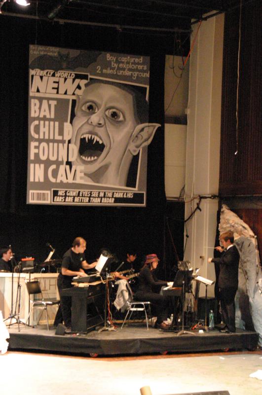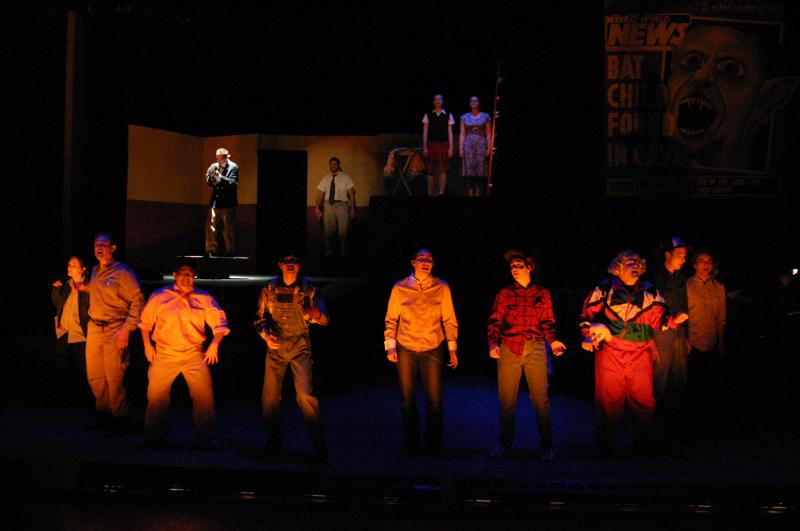Meredith (ML Peters, left) and Shelley (Nori Pritchard) decide on a name for the Bat Boy (David Poland, center). (credit: Jax Kirtley) Bat Boy (David Poland) and Dr. Parker (Paul Giragos), surrounded by scary voices, reach a mutual detente. (credit: Jax Kirtley) Dr. Parker (Paul Giragos), Shelley (Nori Pritchard) and Meredith (ML Peters) test Edgar (David Poland) on his knowledge. (credit: Jax Kirtley) Rick (Pete Chambers, right) decides to take a vote about the fate of the Bat Boy. (credit: Jax Kirtley) Mrs. Taylor (TR Jordan, kneeling) grieves over the death of her son while townspeople (Edmund Golaski, Joe Lowery, Heather Doering, Welkin Pope) look on. (credit: Jax Kirtley) Meredith (ML Peters) and Dr. Parker (Paul Giragos) recall the origins of the Bat Boy. (credit: Jax Kirtley) "Hold Your Bat Boy" (credit: Jax Kirtley) Jamez Kirtley, Heather Brundage, and Erin McLaughlin in the "booth". (credit: Jax Kirtley) |
