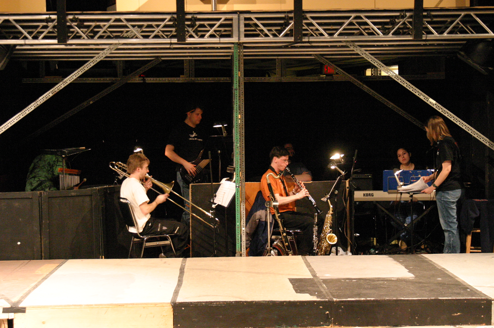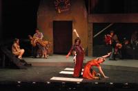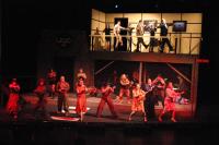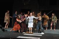 The Urinetown orchestra (Carol Novitsky, percussion; Phillip Ilten, trombone; Jamez Kirtley, bass; Andrew Greenhut, reeds; Elliot Brandow, drums; Joanne Bruno, keyboard; Liz Zakszewski, conductor) (credit: Jax Kirtley) The Rich (Nori Pritchard, Matt Peairs, Pancho Vargas, Lori Huberman, Darrel Cain, Jackie Weber, Noe Kamelamela, Tim Rades, Maria Duaime) celebrate the marvel that is "Mister Cladwell." (credit: Jax Kirtley) Hope (Nori Pritchard) teaches Bobby (Steven Flowers) to "Follow Your Heart". (credit: Jax Kirtley) The Act One Finale (credit: Jax Kirtley) The Poor surround the captured Hope (Nori Pritchard) as they ask "What Is Urinetown?" (credit: Jax Kirtley) Ma Strong (Mary Linton Peters) leads the poor in the "Run Freedom Run", as Hope (Nori Pritchard) relaxes in a nearby chair. (credit: Jax Kirtley) Hope (Nori Pritchard) convinces the poor to spare her life. (credit: Jax Kirtley) Finale: "I See a River" (credit: Jax Kirtley) |