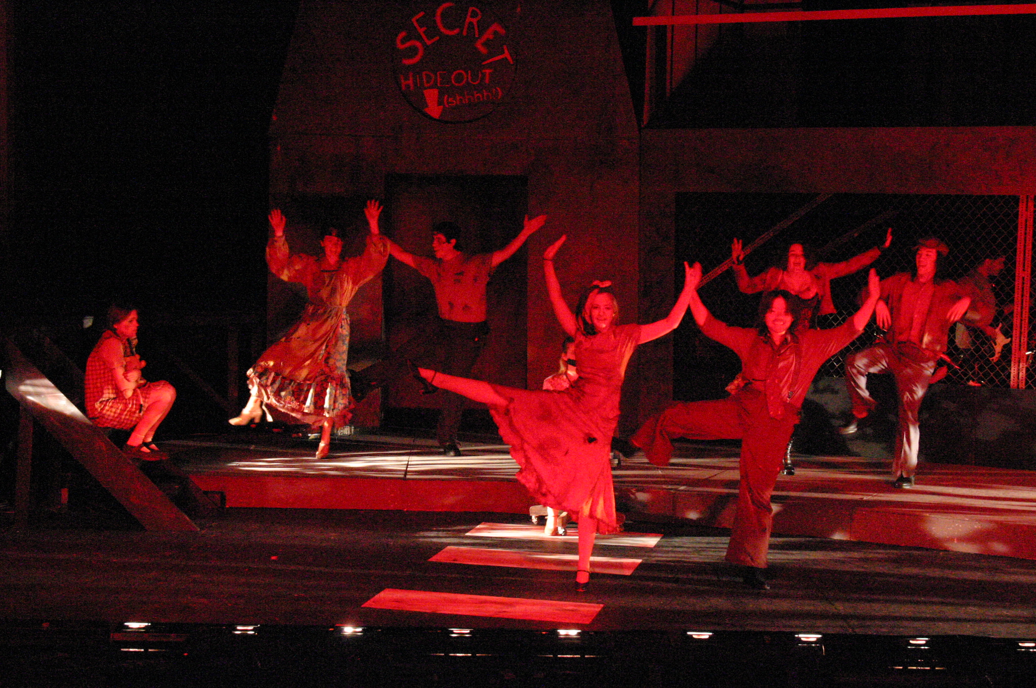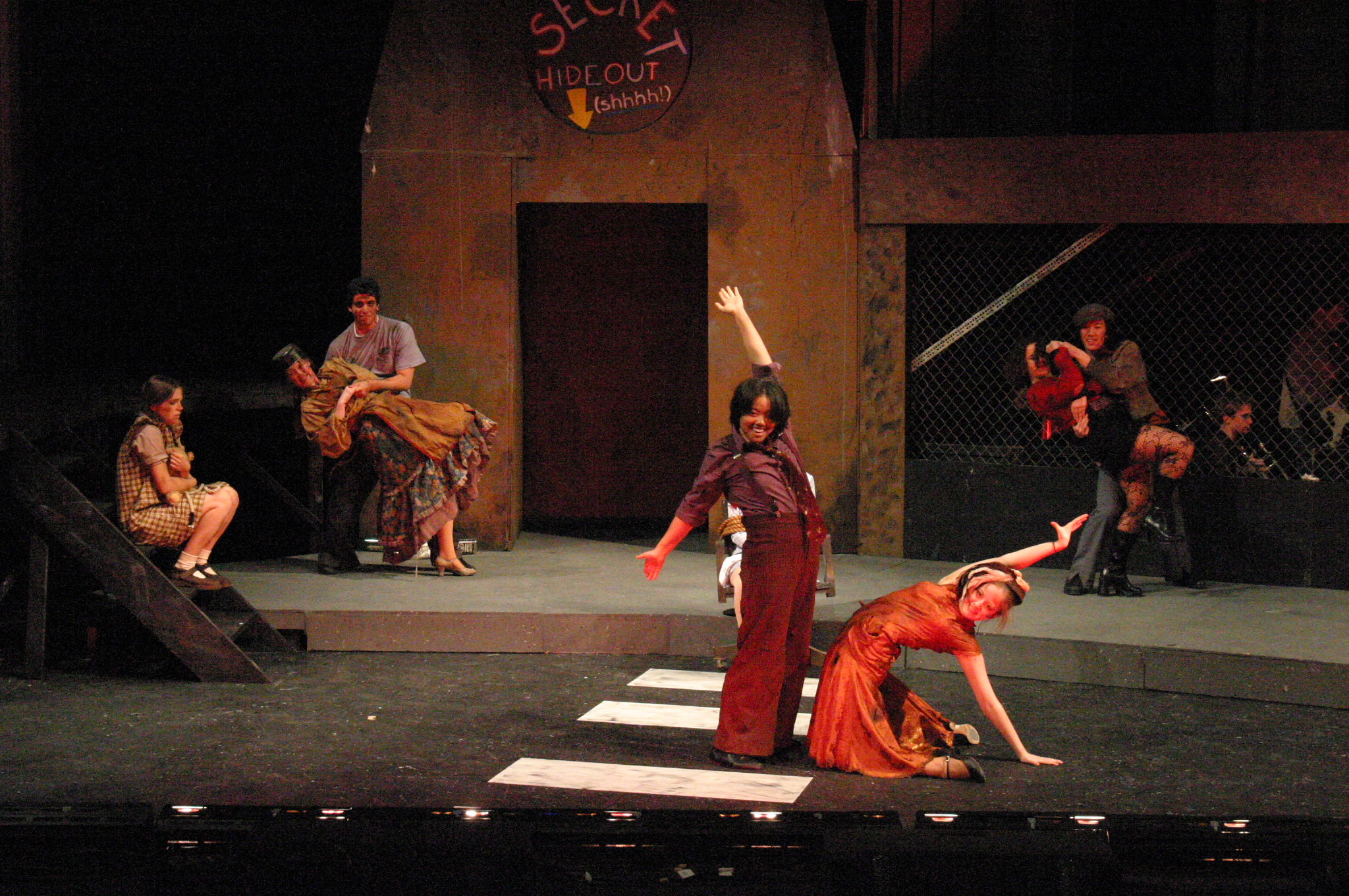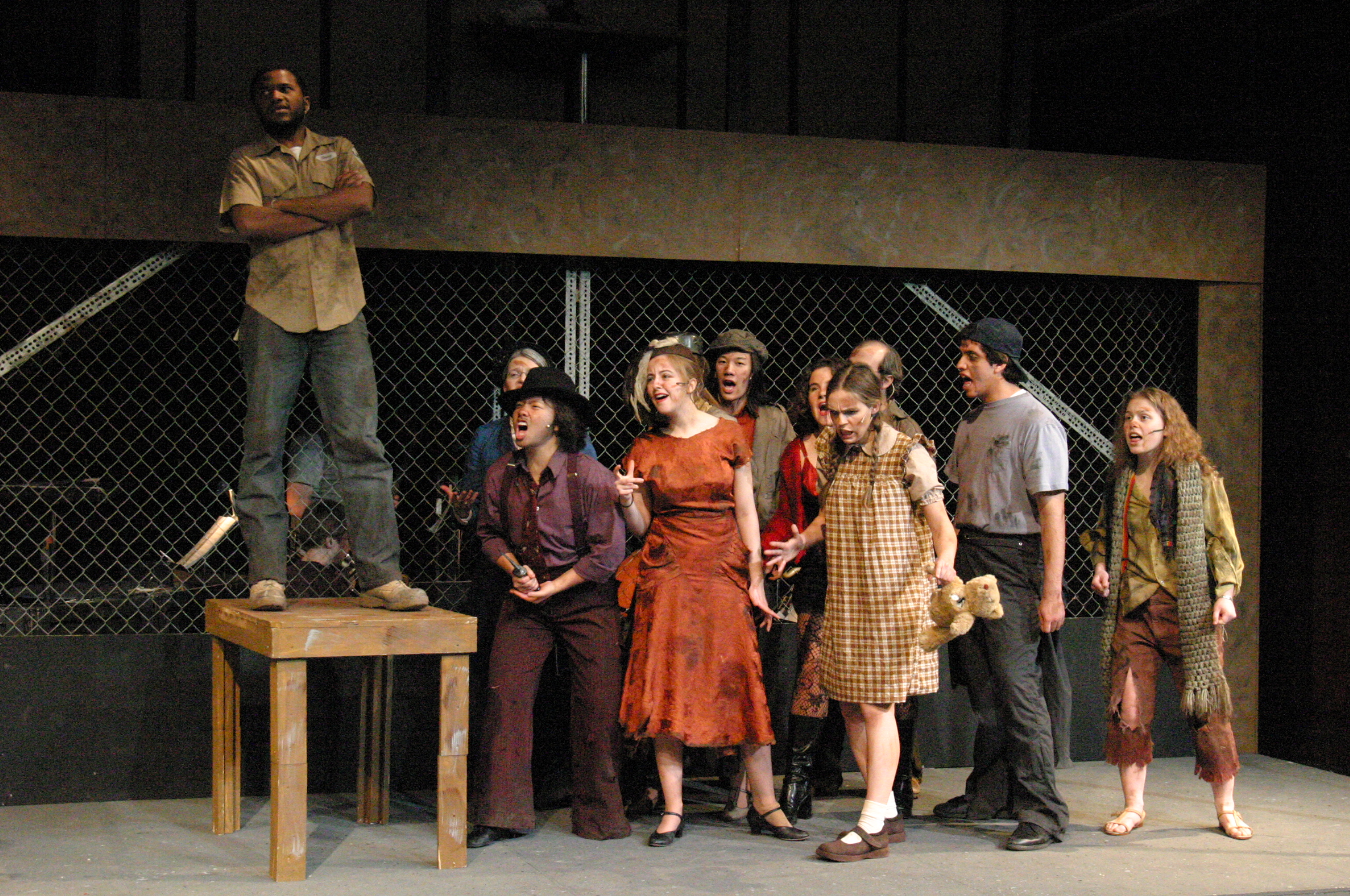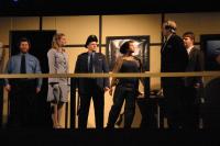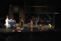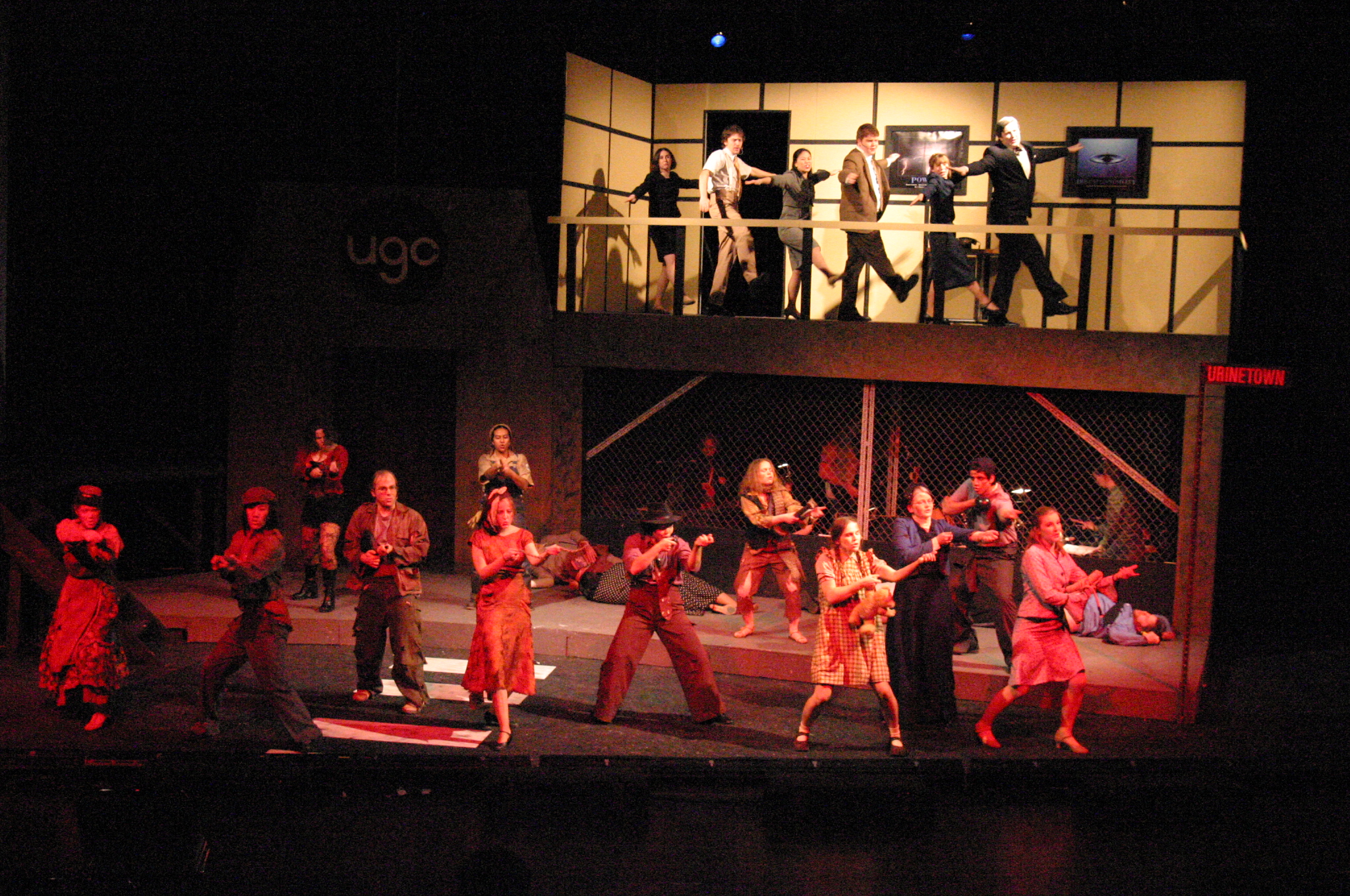 "This is Urinetown." (credit: Jax Kirtley) "Cop Song" (Rob Morrison, Sally Peach, Caitlin Shindler, Kathleen McEnnis, Rogue Shindler, Lee-kai Wang, Stephen Peters, Danbee Kim, Kelly Rockwell, Elena Glassman, Carlos Cardenas) (credit: Jax Kirtley) The Poor (Mary Linton Peters, Elena Glassman, Nicolina Akraboff, Kelly Rockwell, Danbee Kim, Sally Peach, Kathleen McEnnis, Carlos Cardenas, Lee-kai Wang, Stephen Peters) line up to use the local public amenity. (credit: Jax Kirtley) The Rich prepare to quell the rebel uprising. (credit: Jax Kirtley) Little Sally (Nicolina Akraboff) looks on during the raucous "Snuff That Girl" (Kathleen McEnnis, Carlos Cardenas, Kelly Rockwell, Danbee Kim, Sally Peach, Lee-kai Wang) (credit: Jax Kirtley) Senator Fipp (Greg Lohman) confronts Caldwell Cladwell (Darrell Cain) as Caldwell's staff (Maria Duaime, Pancho Vargas, Noe Kamelamela) look on. (credit: Jax Kirtley) "We're Not Sorry" (credit: Jax Kirtley) |