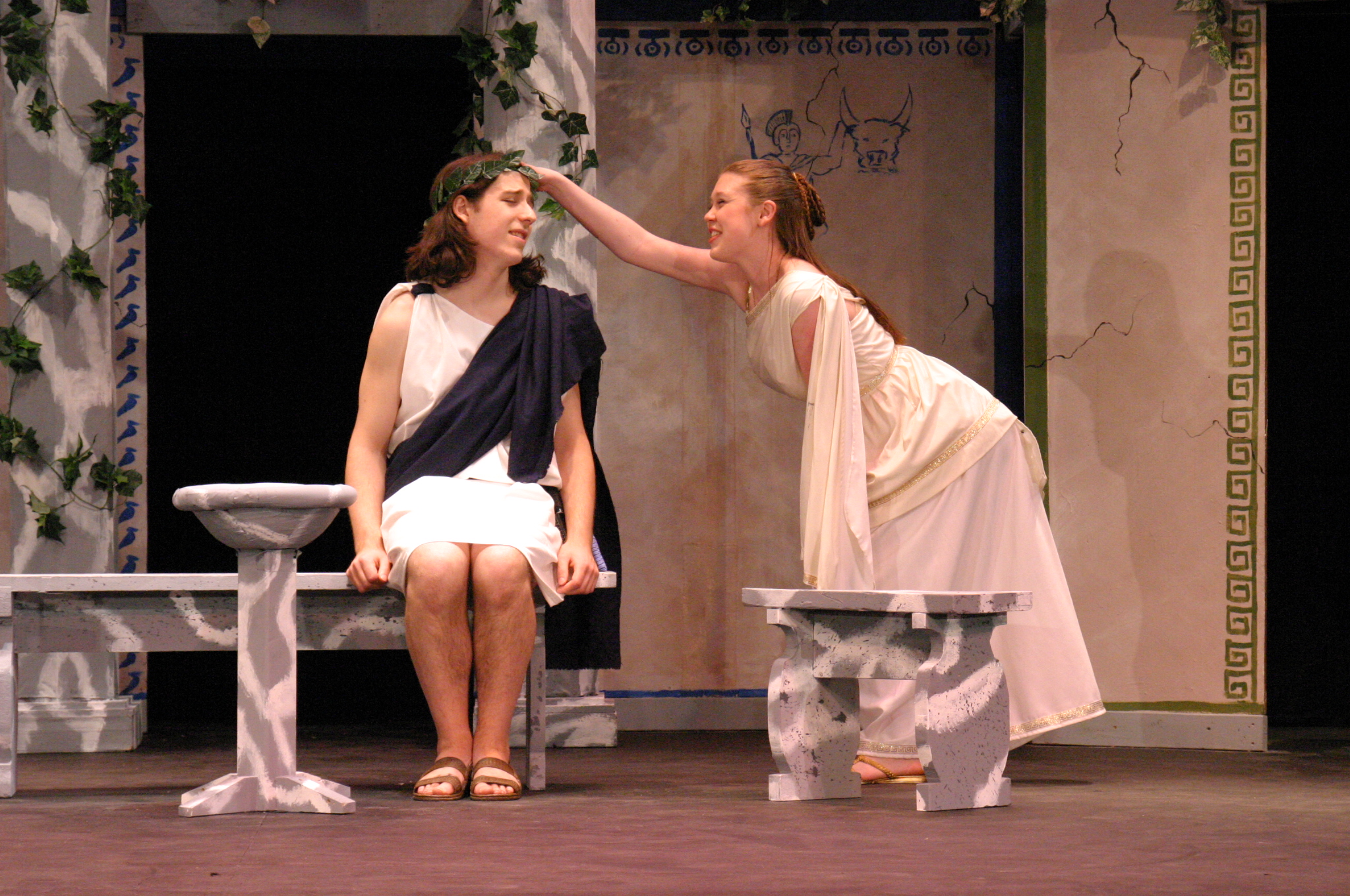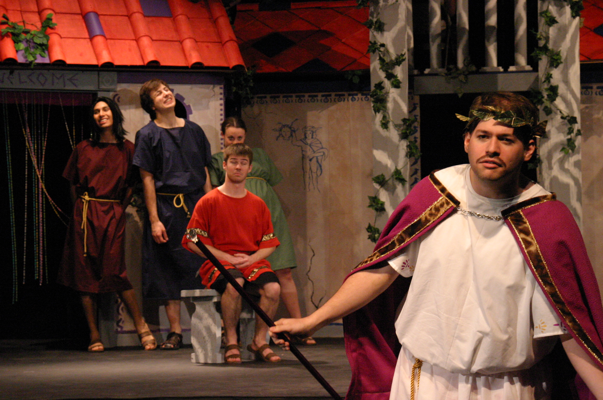Hero (Yonatan Arie Gray '10) and Pseudolus (Tim Abrahamsen '06) discuss love and freedom. (credit: Jax Kirtley) Tintinabula (Janet Lieberman '07) demonstrates her assests to Marcus Lycus (Bill Andrews '06) and his staff (Milo Martinez '08, Armen Babikyan, and Nicole O'Keefe '09), Pseudolus (Tim Abrahamsen '06), and Hero (Yonatan Arie Gray '10). (credit: Jax Kirtley) Pseudolus (Tim Abrahamsen '06) paints a 'Pretty Little Picture' for Hero (Yonatan Arie Gray '10) and Philia (Kathleen McEnnis '07). (credit: Jax Kirtley) Pseudolus (Tim Abrahamsen '06) pretends to be a soothsayer and sends Erronius (Steven Flowers '06) on a long walk -- with help from Hysterium (Daniel Perez '10). (credit: Jax Kirtley) The courtesans (Janet Lieberman '07, Tara Jewett, Shannon Nees '07, Aparna Ramanathan '07, Sarah Slotznick '09, and Theresa Eugenio '07) watch Miles Glorious (Misha Leybovich G) give Pseudolus (Tim Abrahamsen '06) an emphatic hello. (credit: Jax Kirtley) Philia (Kathleen McEnnis '07) waits on the roof for orders from her captain. (credit: Jax Kirtley) Miles Gloriousus (Misha Leybovich G) prepare for a funeral -- of sorts. (credit: Jax Kirtley) |