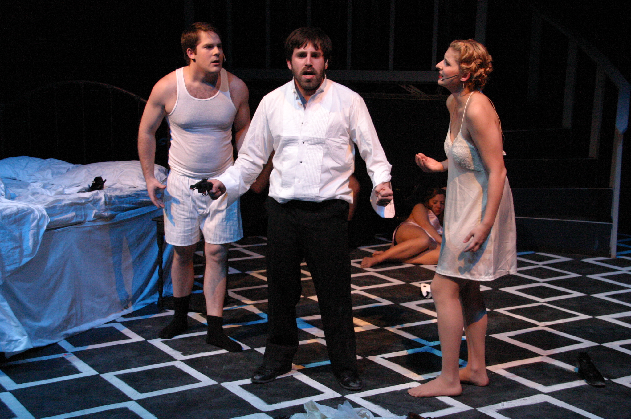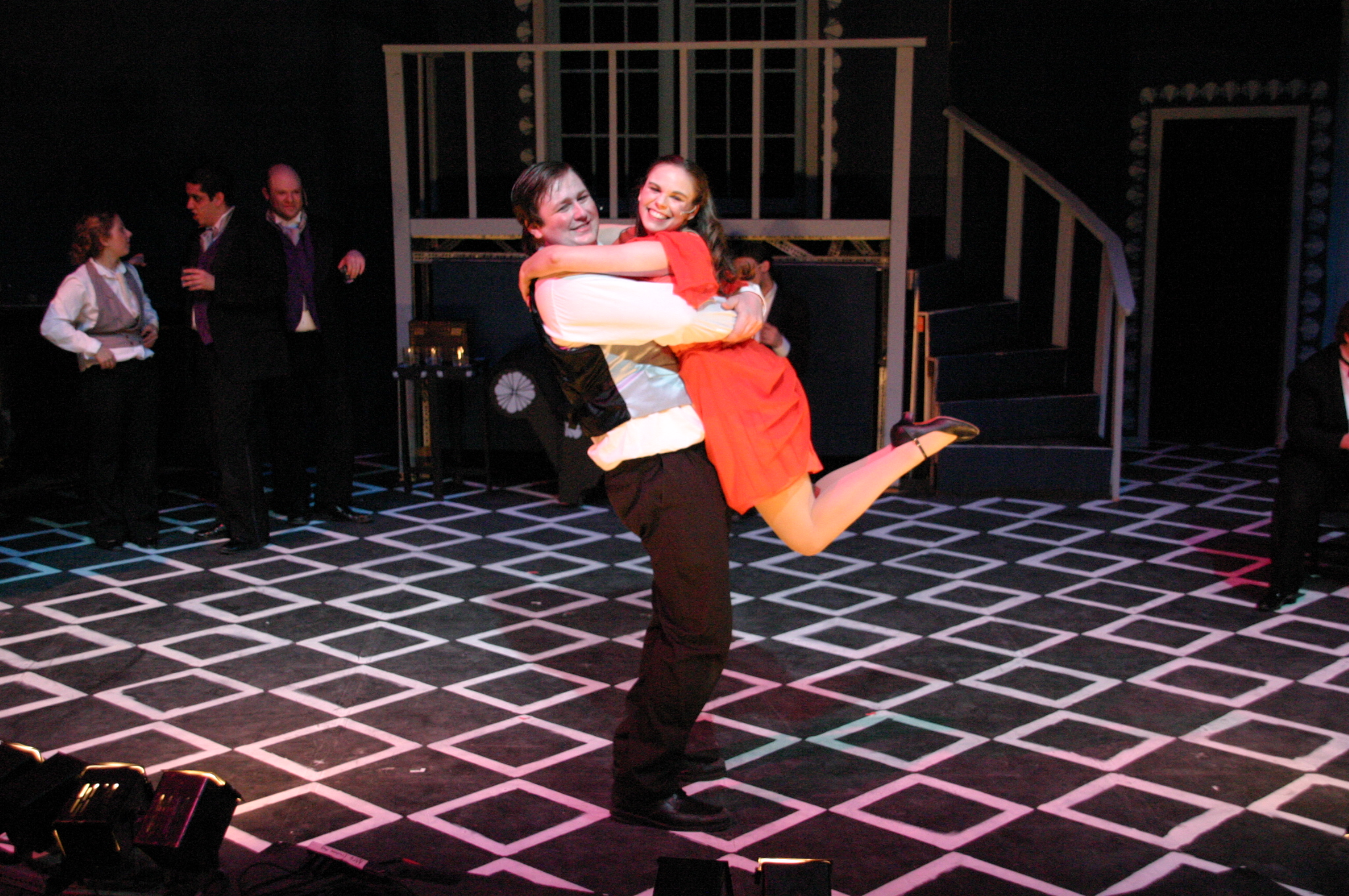 Apartment: Queenie (Carrie A. Lee '10), Burrs (Matthew Cibborowski '08), Ensemble (Balcony L to R: Luis C. Loya '06, Darrell Cain '08, Nicolina Akrahoff '07, Estevan Milo Martinez '08, Helen O'Keefe '09, Dave Berger, Carlos Cardenas '09, Matt Peairs '09, Karen Hart '11, Karen Wong '10, Krista Sergi) (credit: Jax Kirtley) An Old Fashioned Love Story: Madeline True (Krista Sergi) (credit: Jax Kirtley) What is it about her: Kate and Burrs (Danbee Kim '09 and Matthew Cibborowski '08) (credit: Jax Kirtley) Let me Drown: Burrs (Matthew Cibborowski '08) (credit: Jax Kirtley) Make me Happy: Black, Burrs, Queenie (Matt Stern '08, Matthew Cibborowski '08, and Carrie A. Lee'10) (credit: Jax Kirtley) Orchestra (credit: Jax Kirtley) |