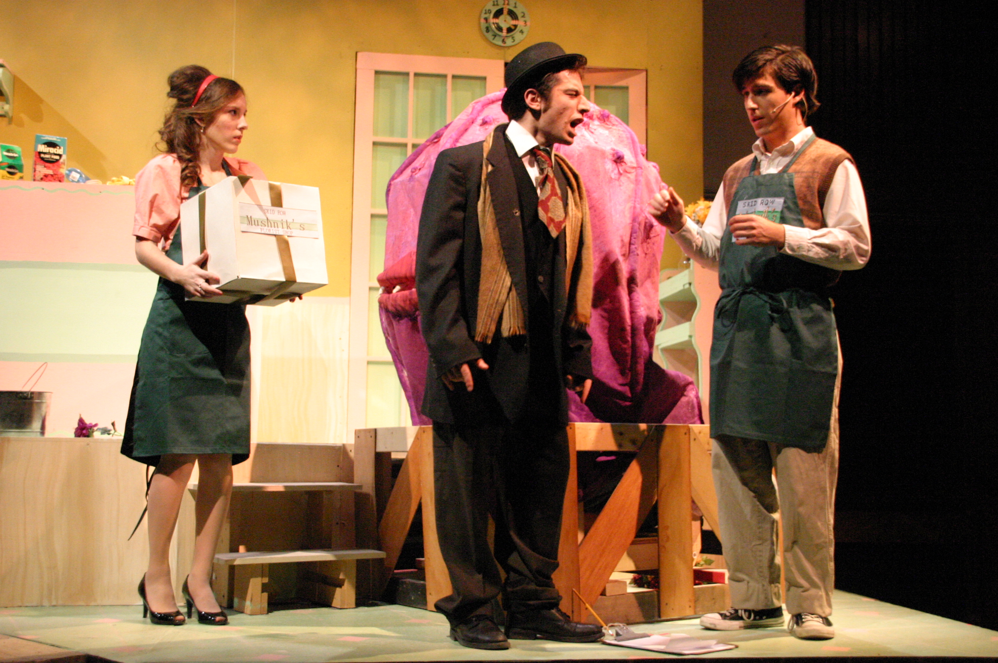 Audrey (Rachel Williams '12), Mr. Mushnik (Zachary Barryte '13), Seymour (Yoni Gray '10) and the Plant (Michael Glicksman) (credit: Jax Kirtley '96)
